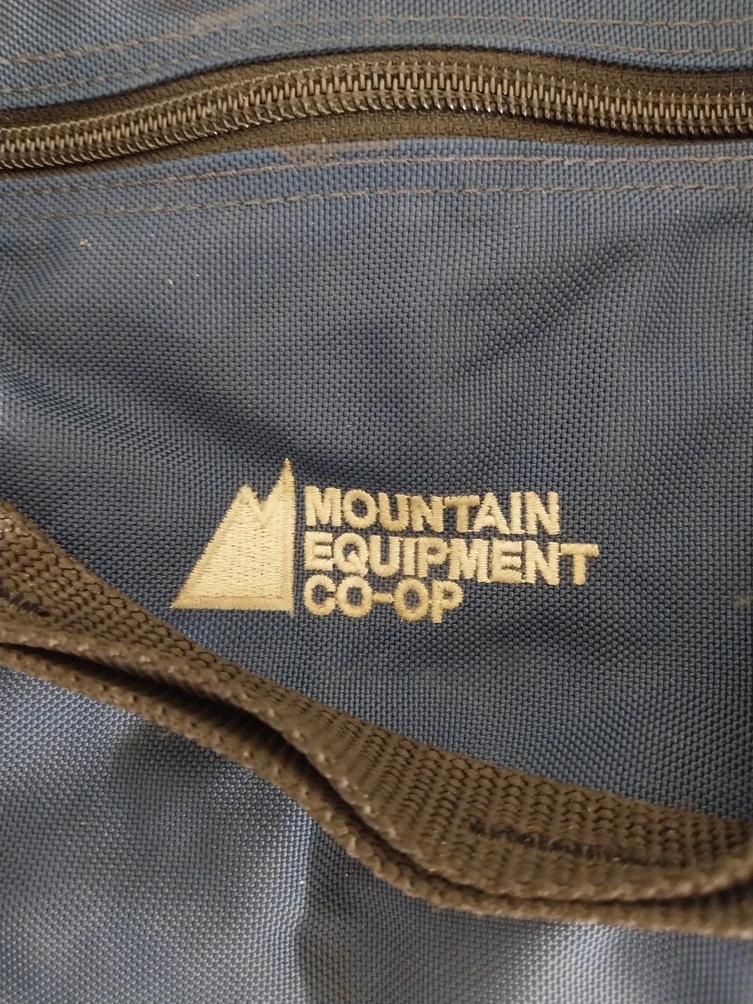 Blue Mountain Equipment Co-op duffel bag with multiple zipper compartments. Bag is made of durable fabric.