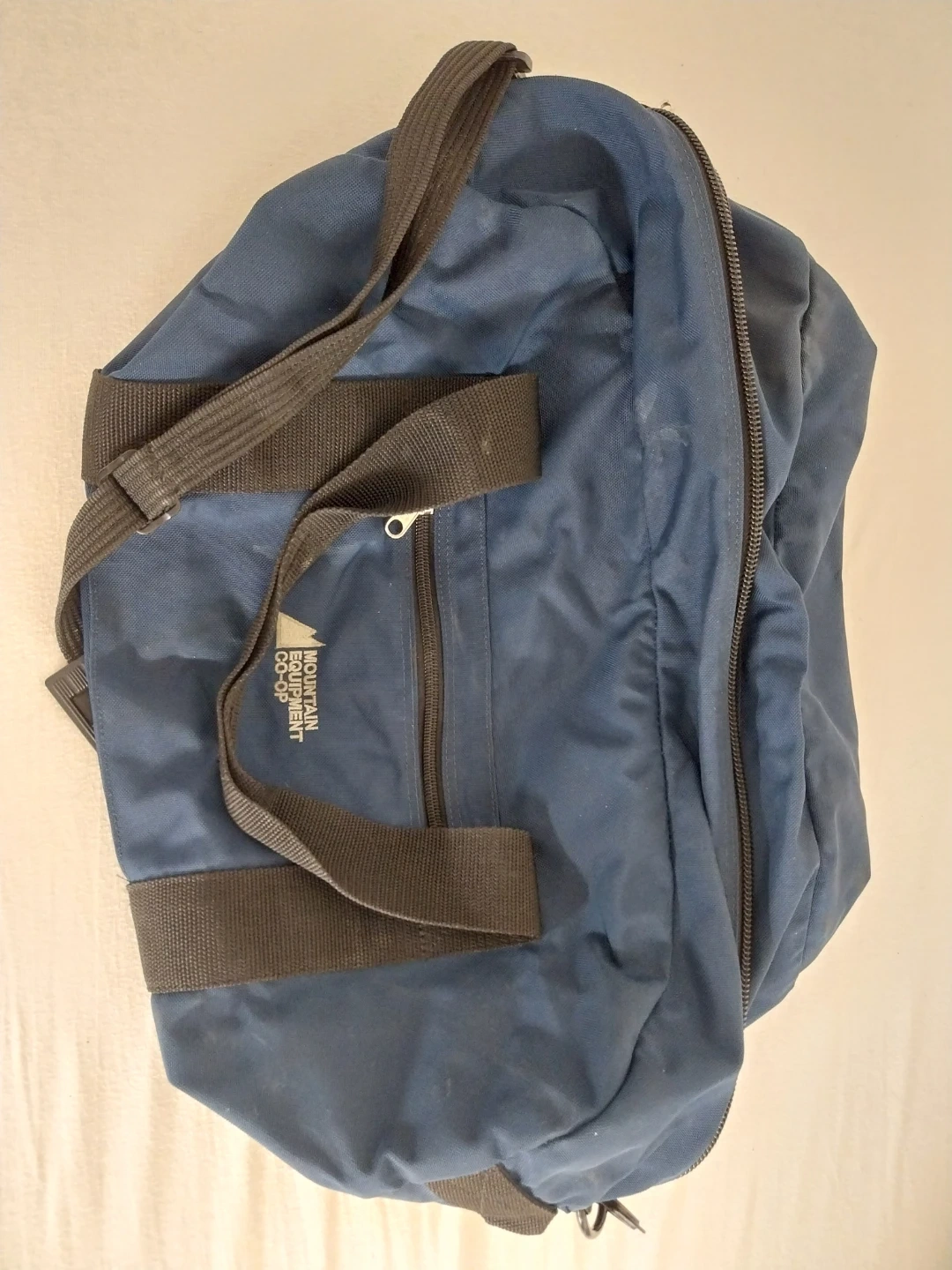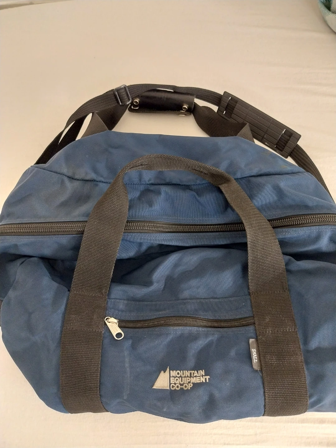 Blue Mountain Equipment Co-op duffel bag with multiple zipper compartments. Bag is made of durable fabric.