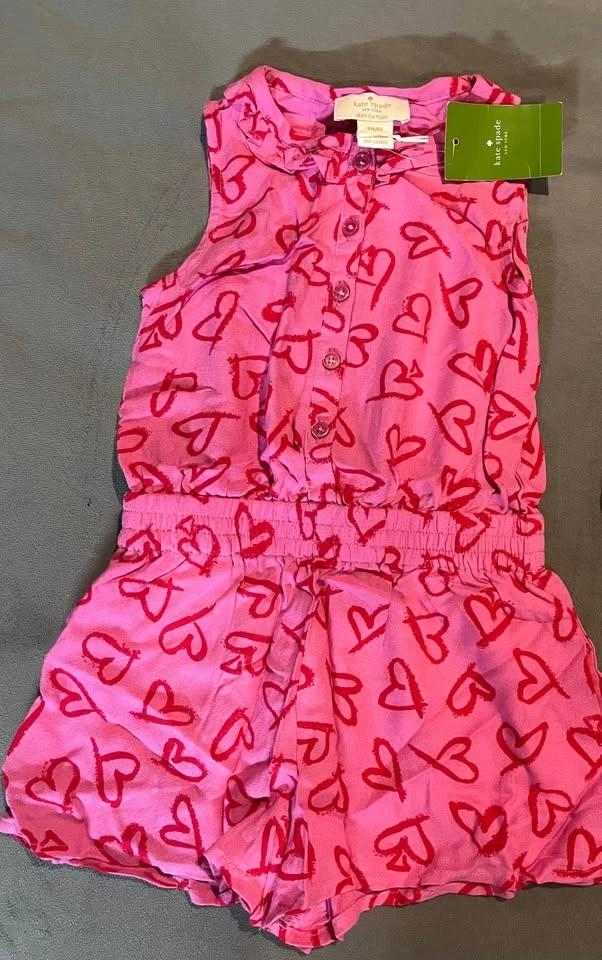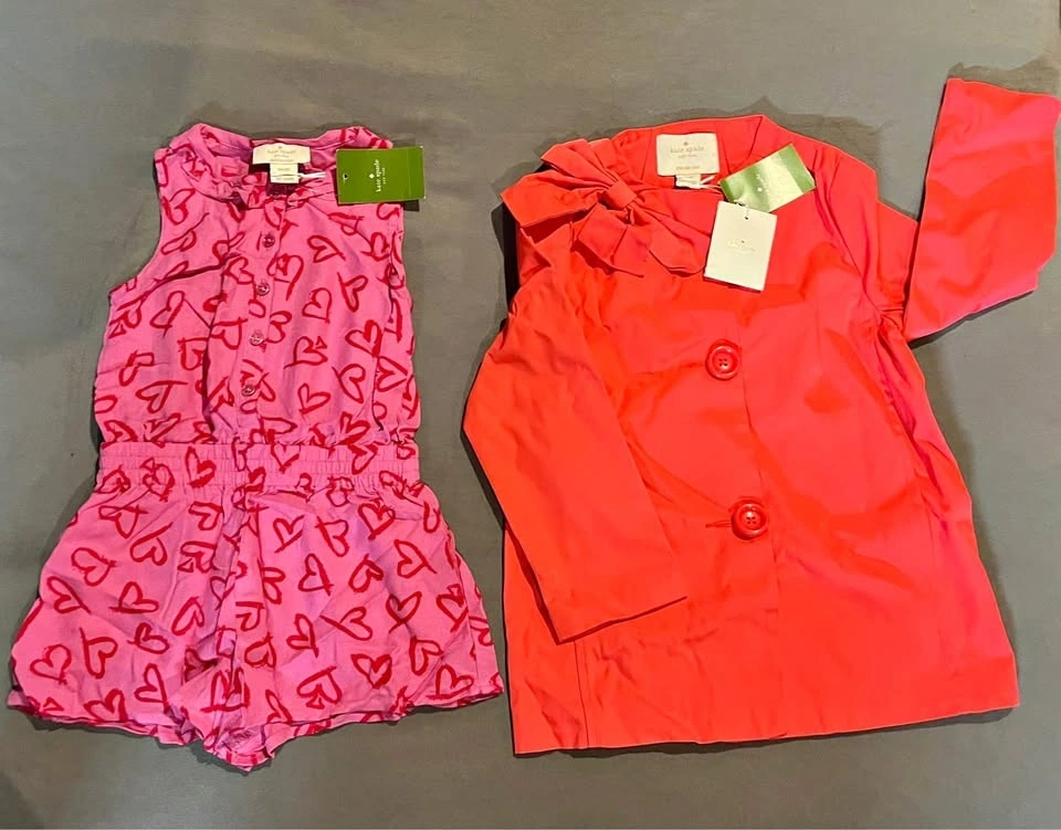 BNWT Kate Spade girls pink romper with red hearts (4y) & coral spring jacket with bow (5y). Romper retails $74 plus taxes and jacket retails $128 plus taxes. Take both for $75.