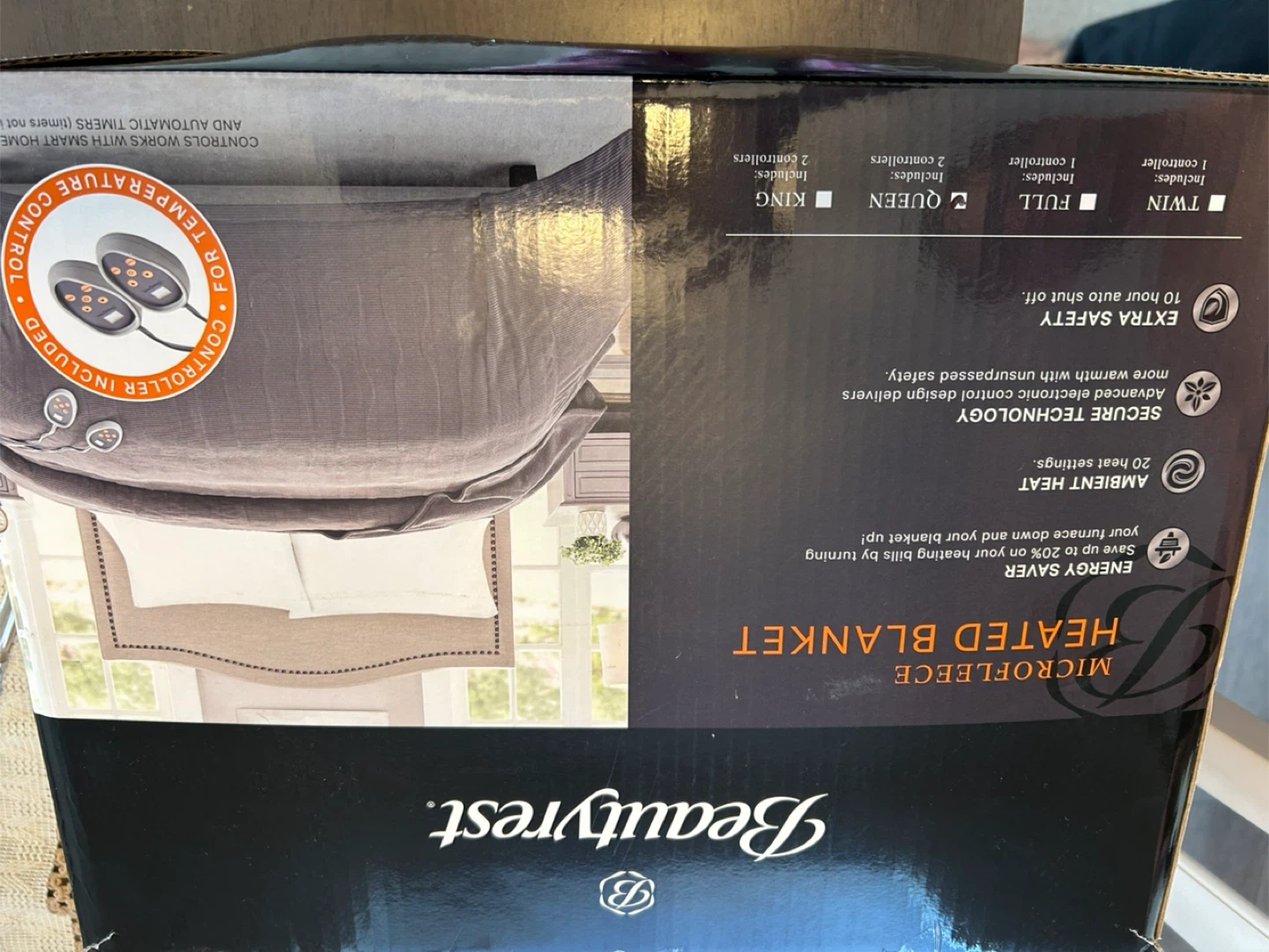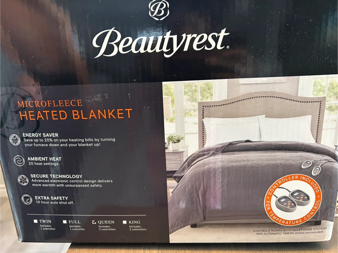 Selling a brand new Beautyrest Microfleece Heated Blanket! This is a Queen size and comes with 2 controllers. It's energy saving, with ambient heat and secure technology for safety. Extra safety with 10 hour auto shut off. Comes in the original box!