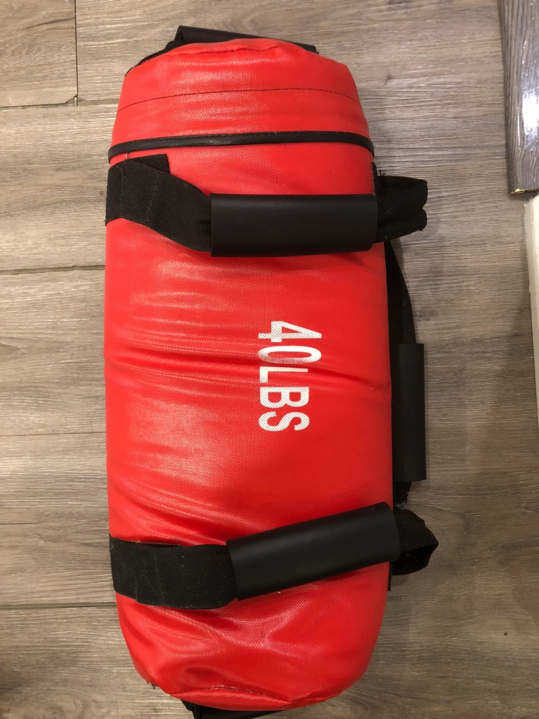 This red fitness sandbag weighs 40 lbs. It's made of durable material and has multiple handles for various exercises. Perfect for strength and conditioning workouts!
