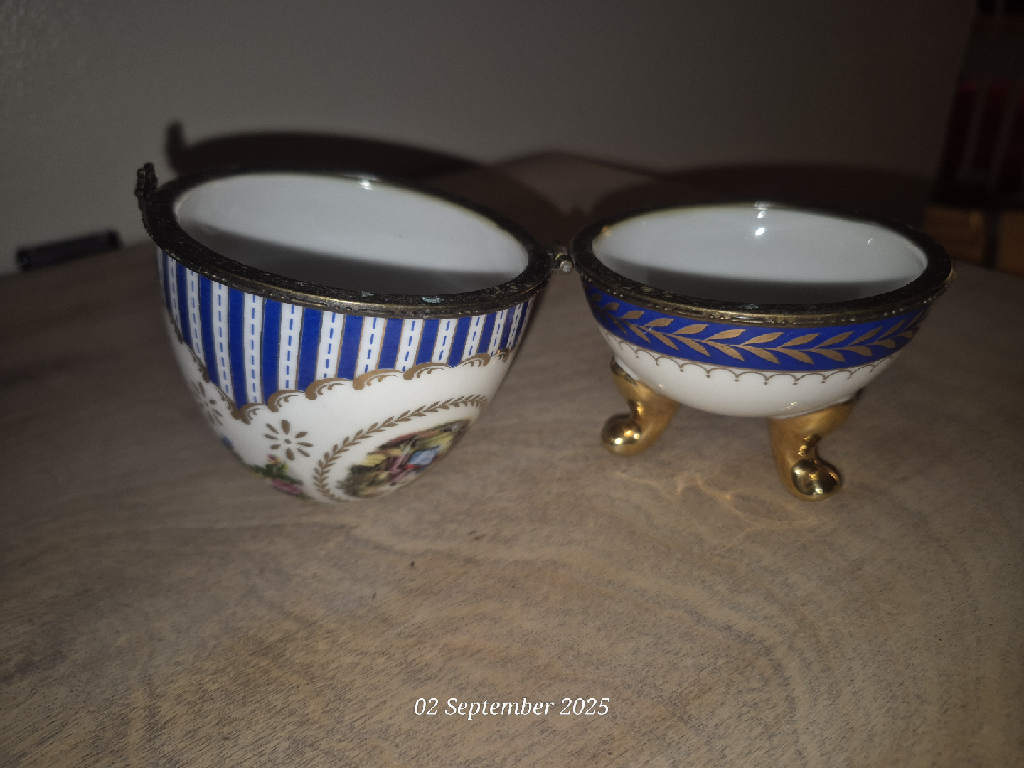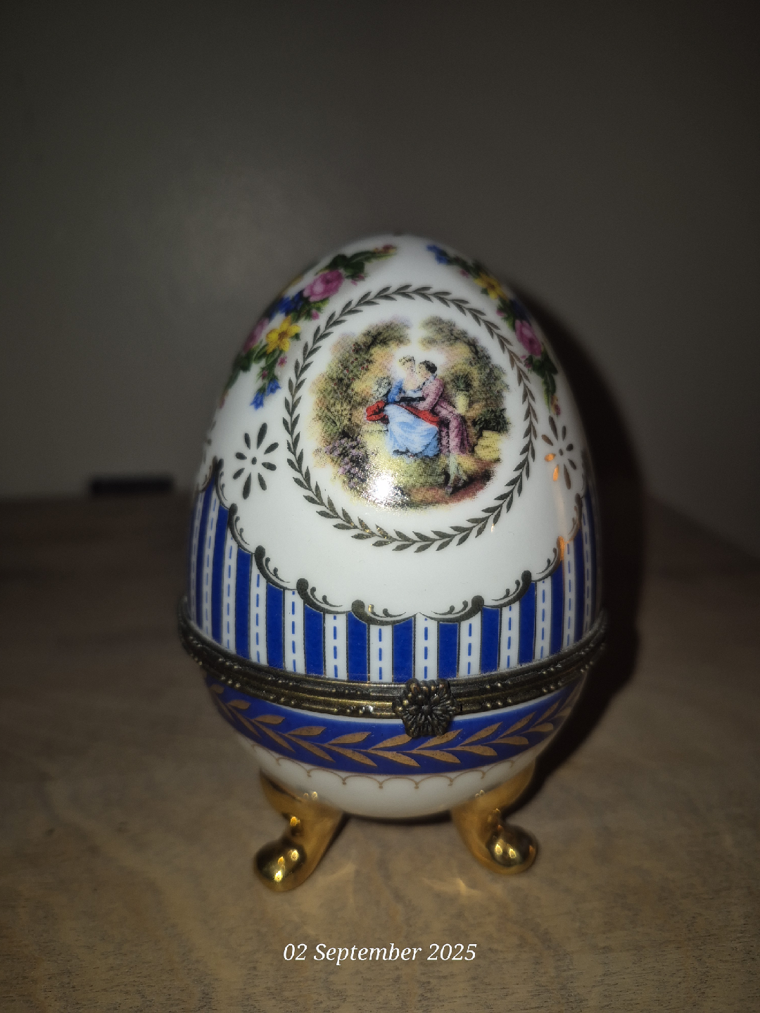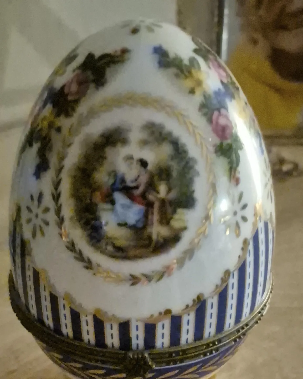 Selling a beautiful vintage egg trinket box! It features a lovely design with a picture and blue stripes. The box opens to reveal a white interior with gold accents and little legs. It's a unique and charming piece for any collection!