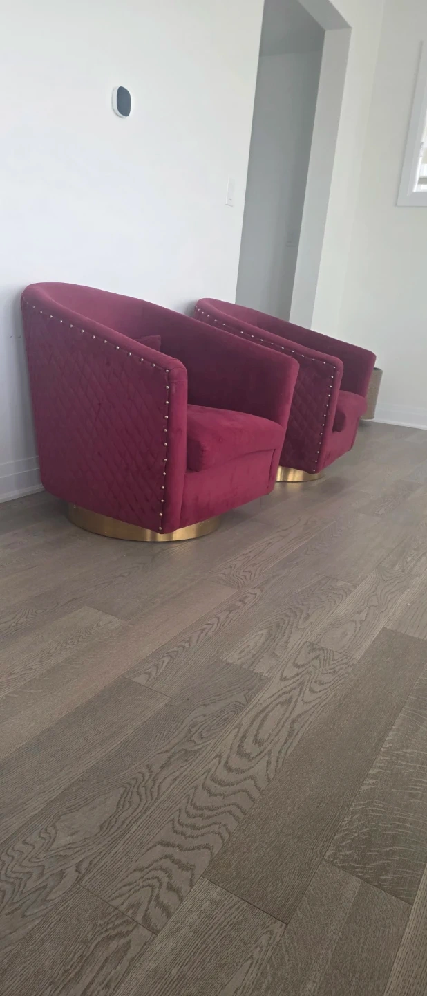 This burgundy velvet accent chair features a quilted design and brass nailhead trim. It has a comfortable swivel base, perfect for any living room or lounge area. Add a touch of elegance to your space!