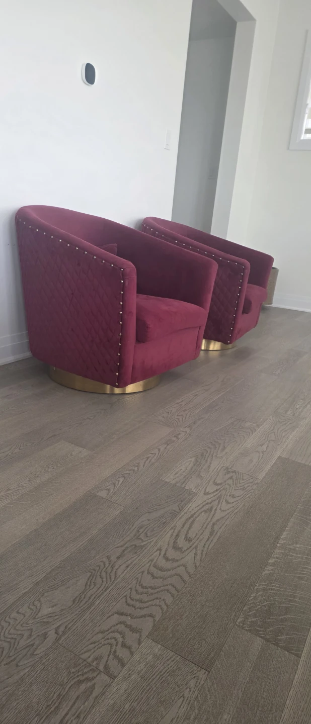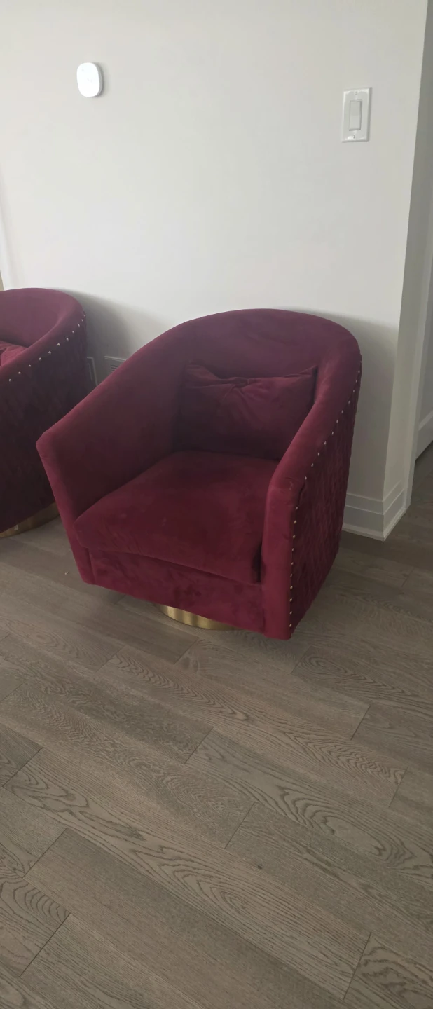 This burgundy velvet accent chair features a quilted design and brass nailhead trim. It has a comfortable swivel base, perfect for any living room or lounge area. Add a touch of elegance to your space!