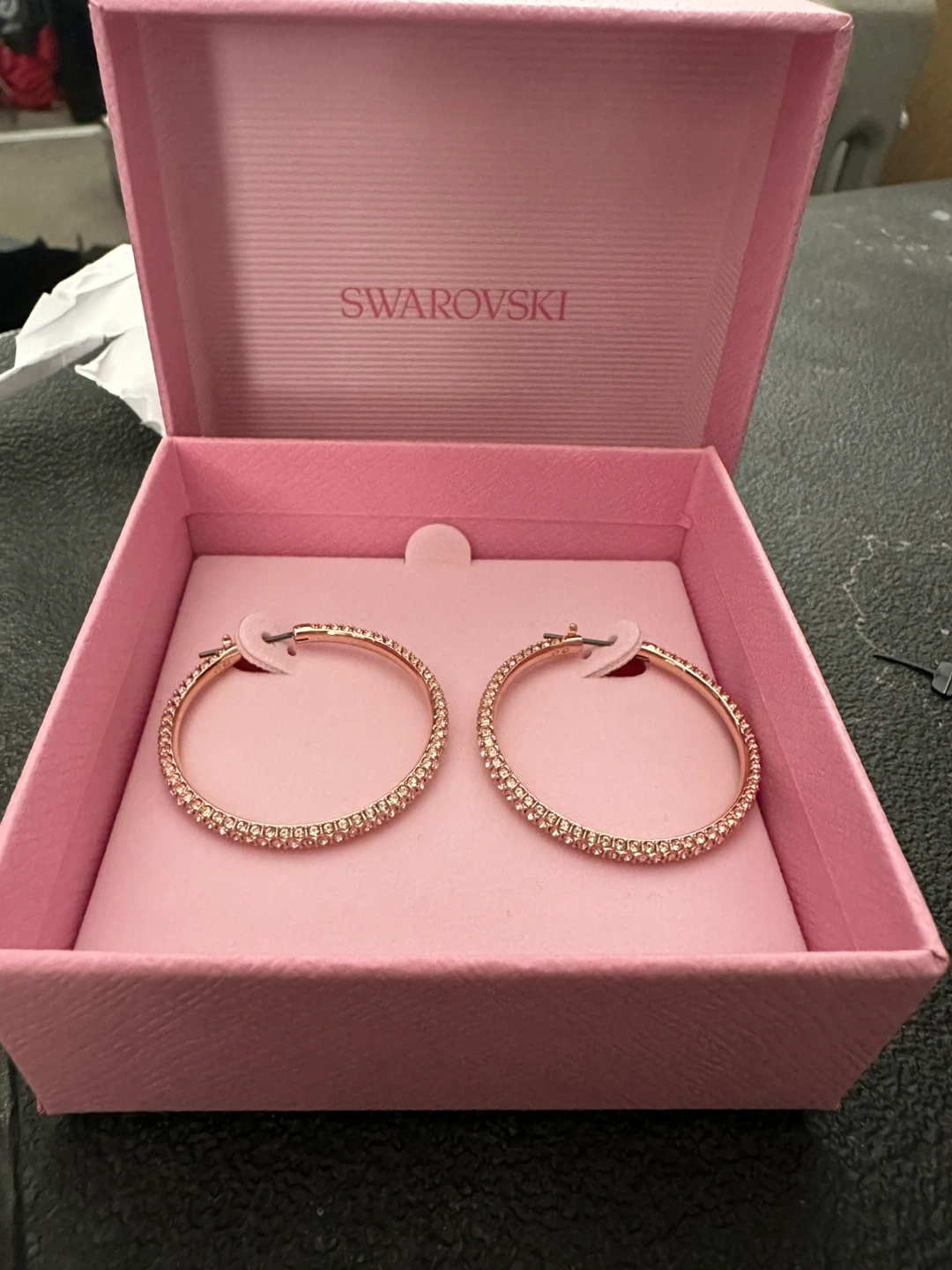 Sparkling Swarovski hoop earrings in rose gold tone. These feature a pavé crystal design. Includes original box. Perfect for adding a touch of glam to any outfit!