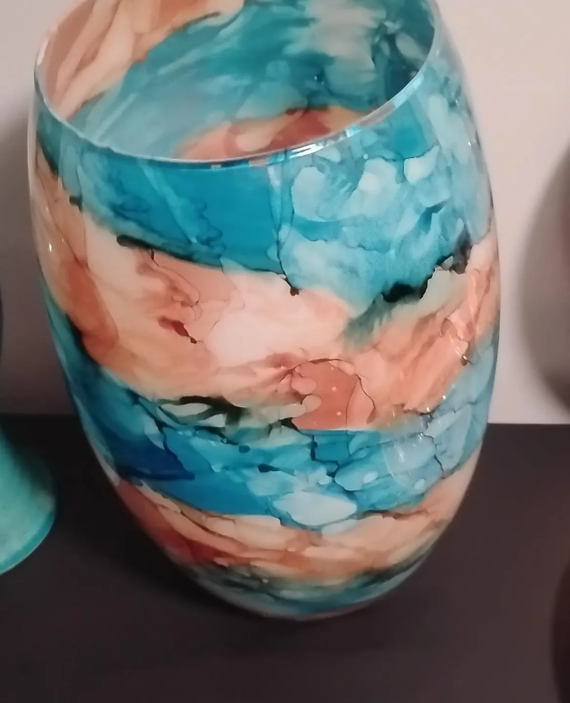 Beautiful hand-blown art glass vase featuring a lovely blend of turquoise and peach tones! It's in great condition and ready to add a pop of colour to your home
