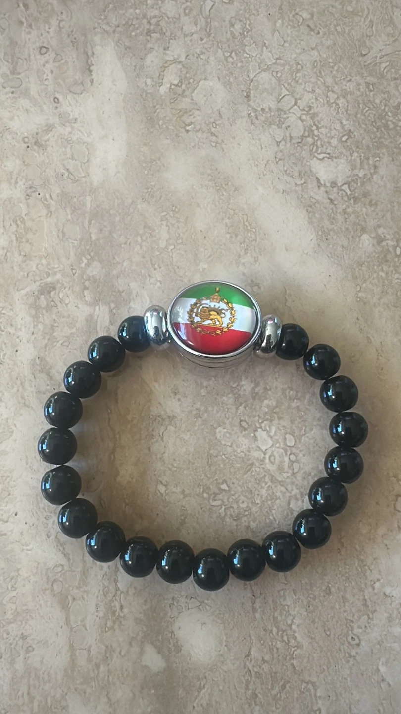 This elastic beaded bracelet features black beads with a central emblem displaying the flag of Iran. It's a stylish accessory with a patriotic touch. The beads are smooth and shiny, strung together for a comfortable fit. This piece would be great for showing national pride!