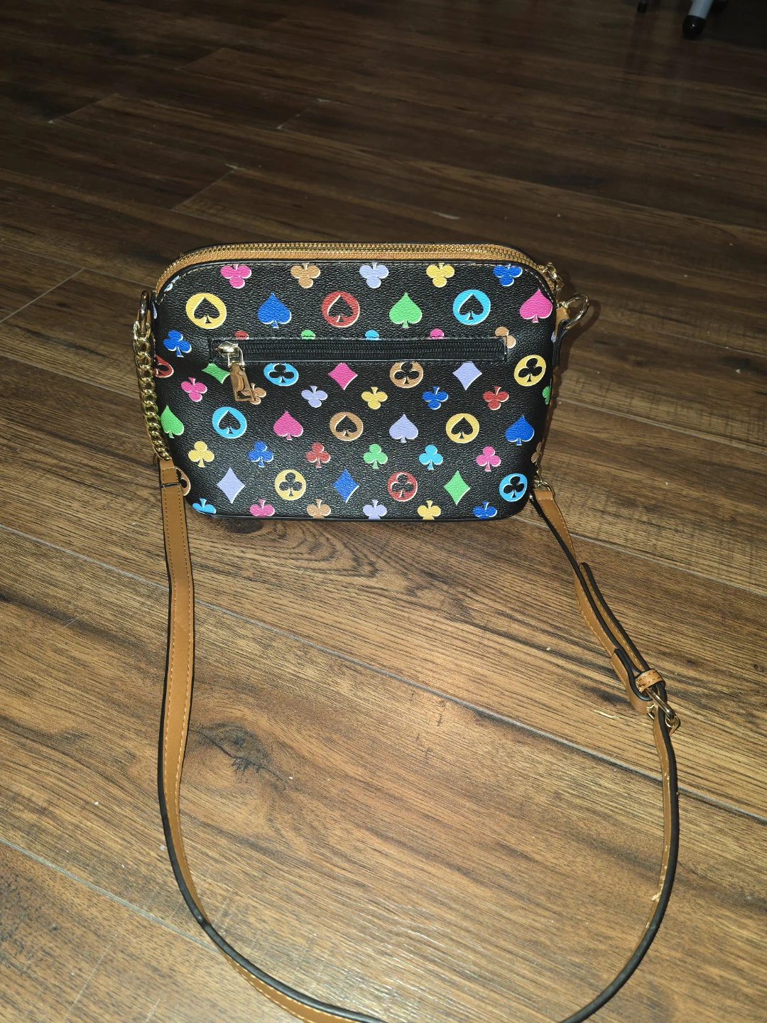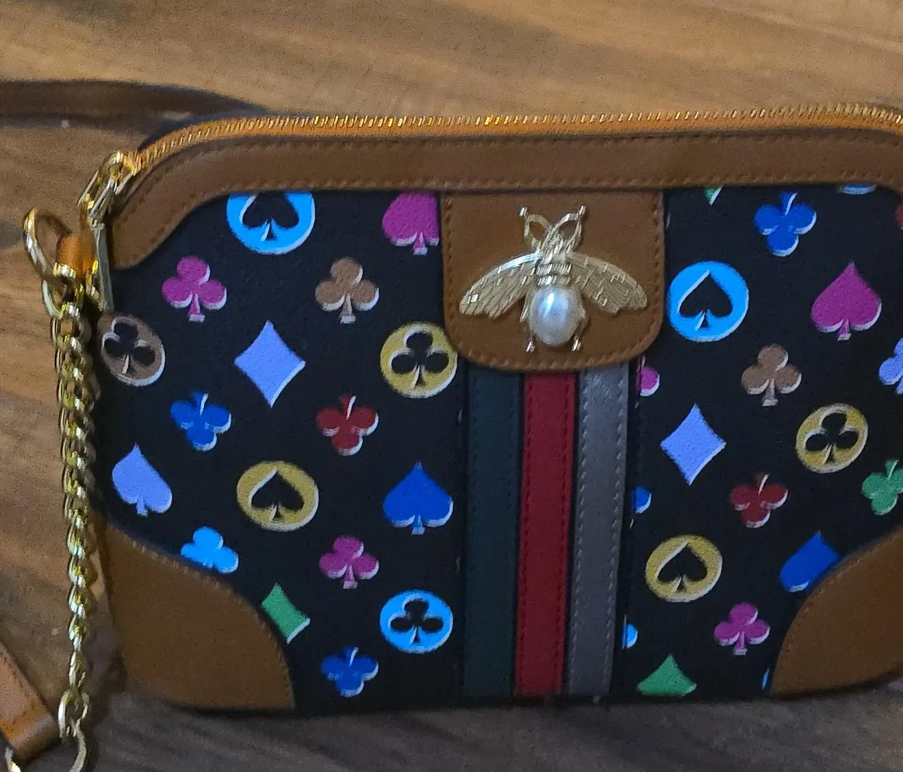 This is a cute crossbody bag with a bee on the front. The bag has a black background with card suit symbols in different colors. It has a gold chain and a long adjustable strap. The trim is a tan color.