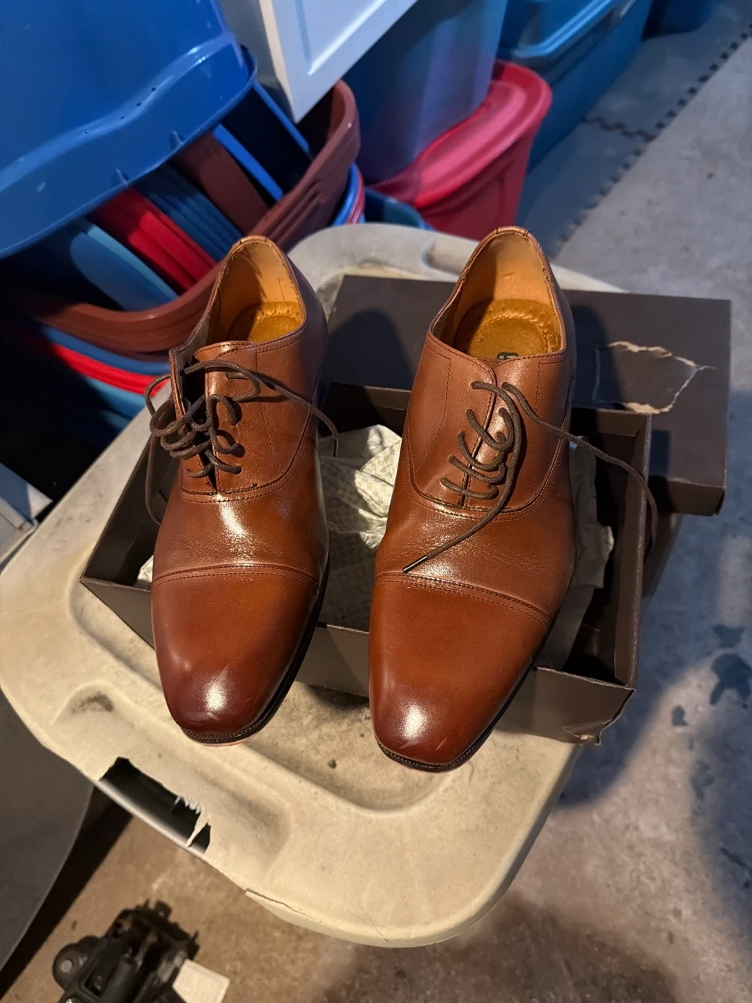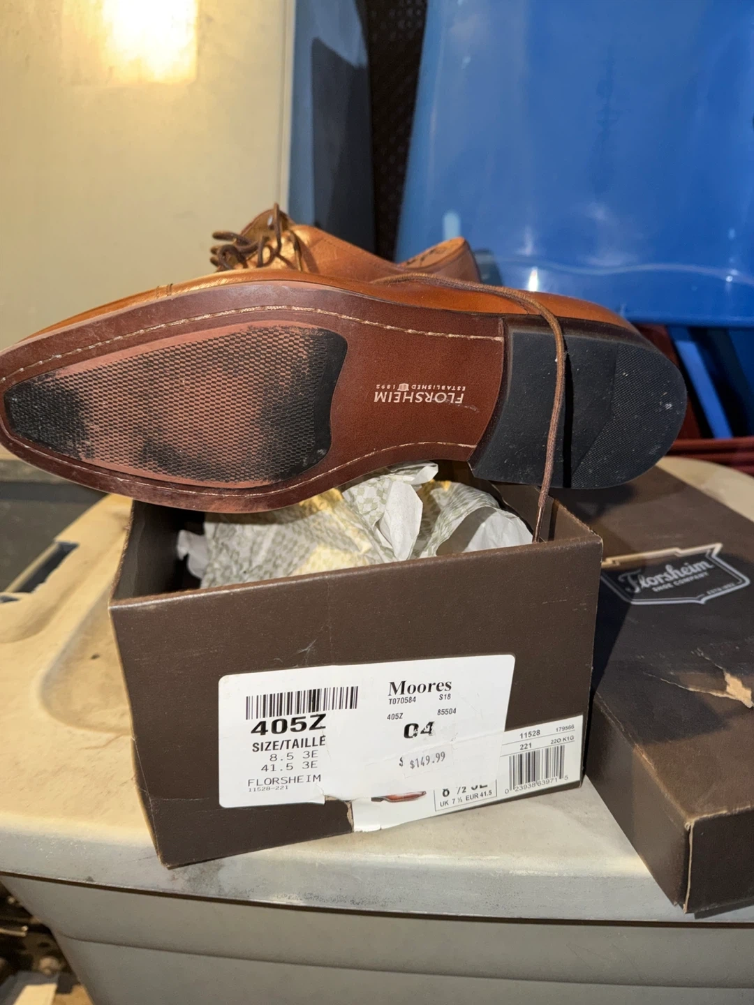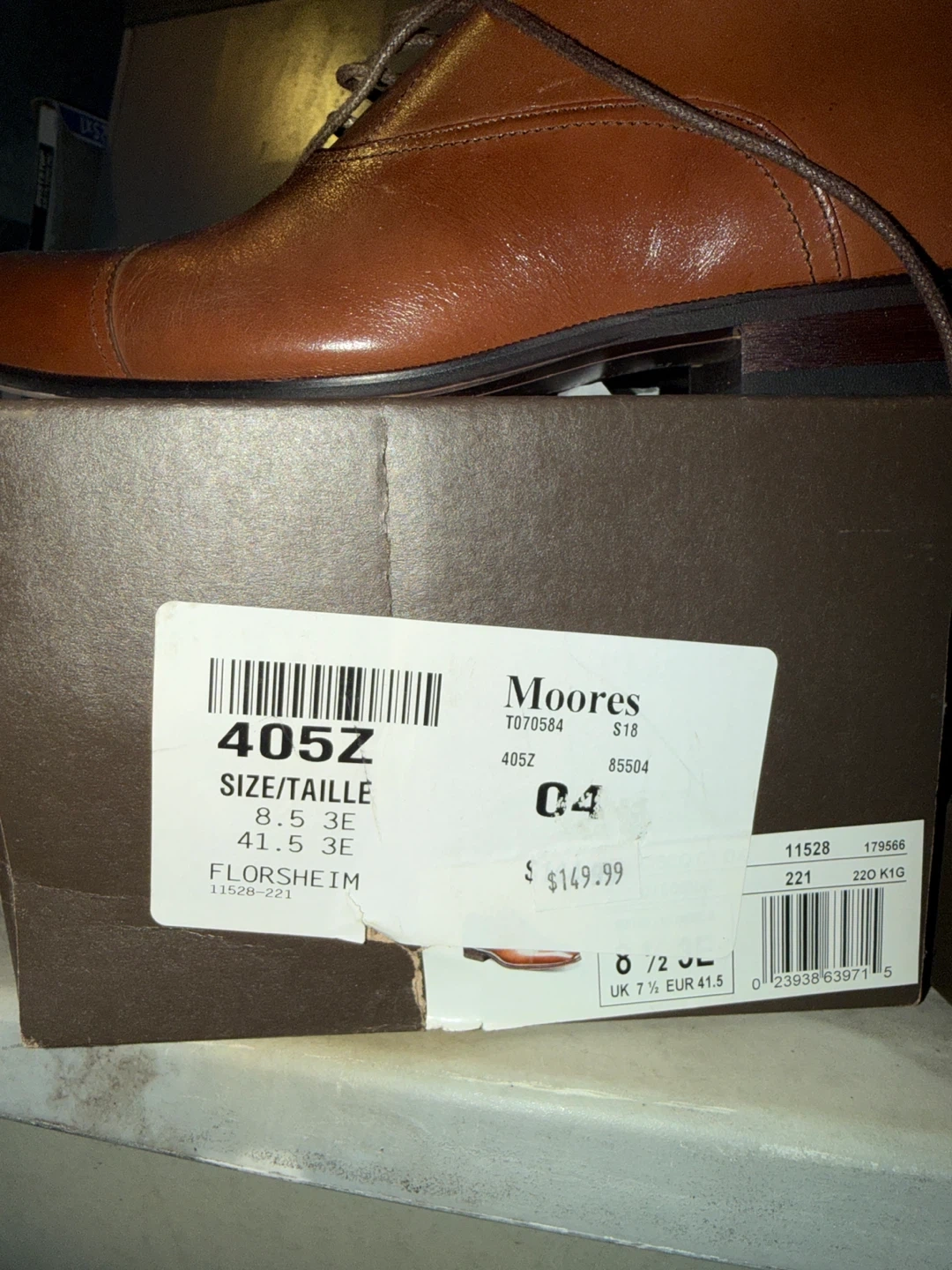 Florsheim Moores Oxford shoes in a rich brown leather. These dress shoes come in a size 8.5 3E. They're crafted from quality leather for a classic look.