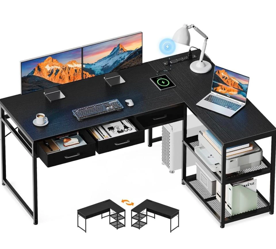 This L-shaped desk features large capacity drawers for all your essentials. It also has double-tier storage shelves for versatile organization. The desk is reversible and built with a sturdy metal frame. It's perfect for optimizing your home office space!