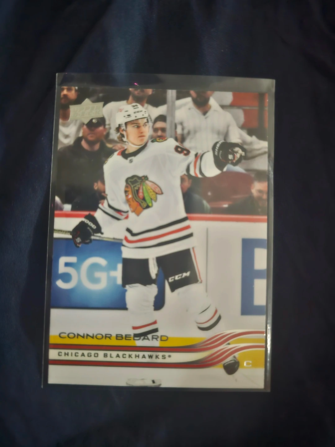 This is a Connor Bedard Chicago Blackhawks hockey card. It features the player in his jersey. The card is made from standard cardstock material. I have 9 available