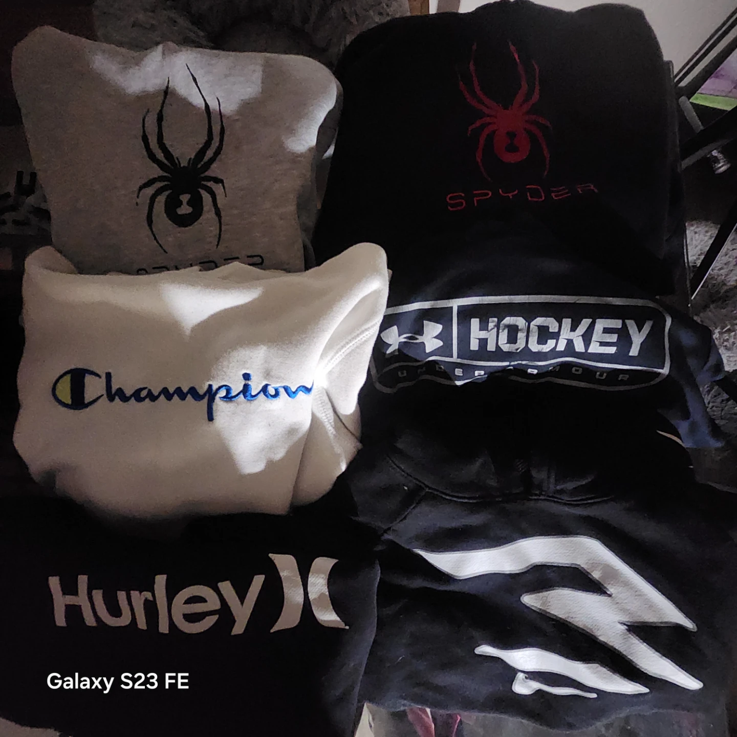 6 hoodies from popular brands. You'll get two Spyder, one white Champion, one Hurley one Under Armour Hockey, one Zoo York and one Nike hoodie.