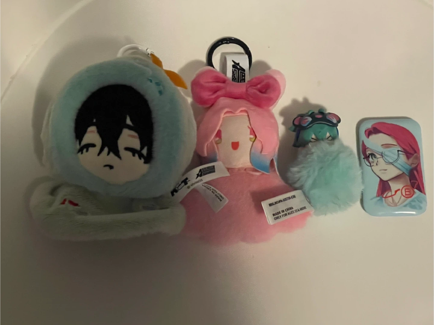 Only pick up at 806 kennedy road and cash only please! Trading for luka in those didferent series or buy all for $35 or separate ivan keychain plush: $15, mizi keychain plush: $10, till plush: $8 mizi pin: $6This lot includes three plush charms and one pin. Two plushies have character art, and one is a fluffy keychain. The pin features anime-style artwork and a mask. Recommended for ages 15 and above.