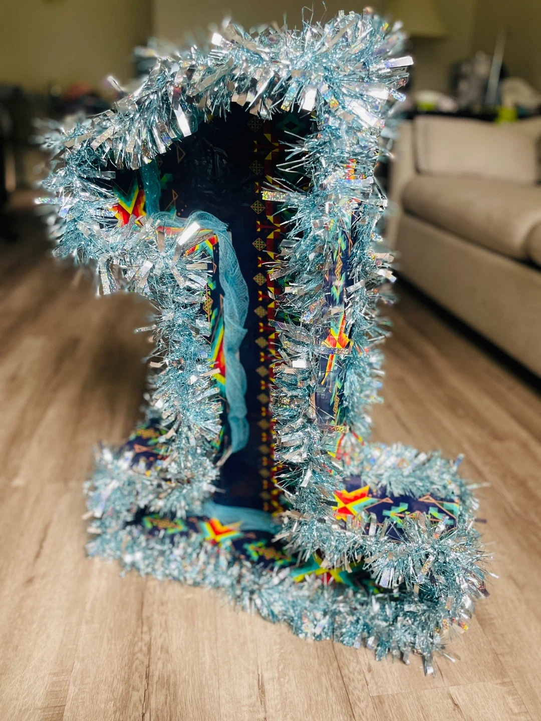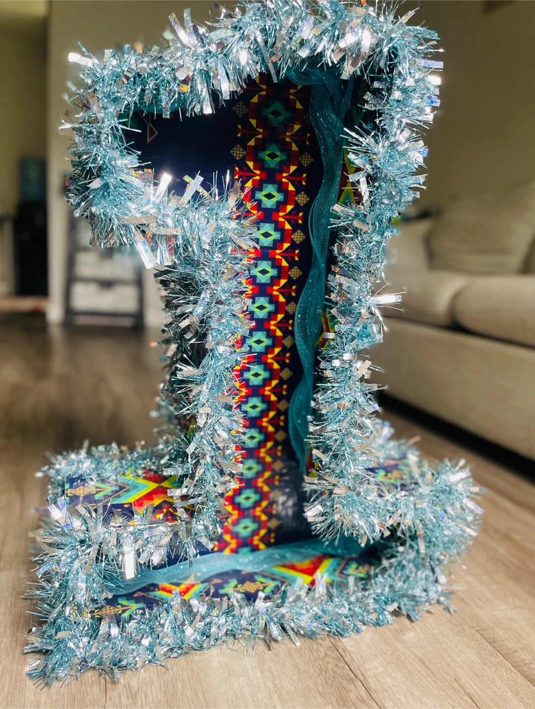 65Festive number one decoration in boy blue, perfect for a first birthday or celebration! It's decorated with colourful patterns, a ribbon, and shiny tinsel. Add a bit of sparkle to your special occasion