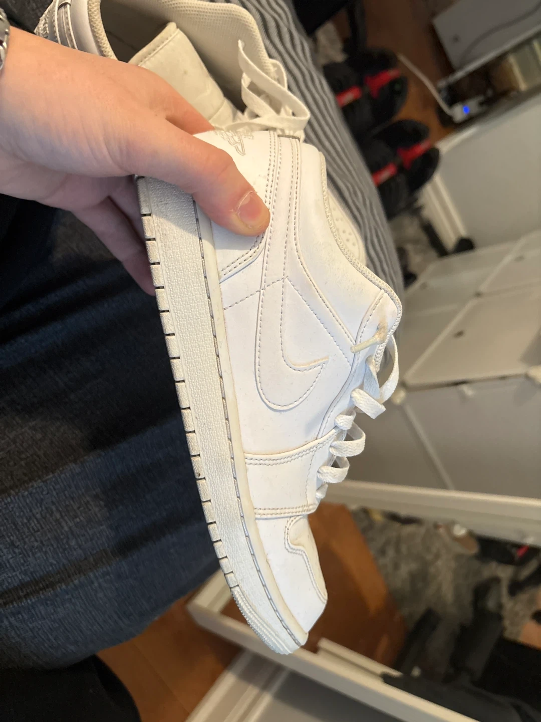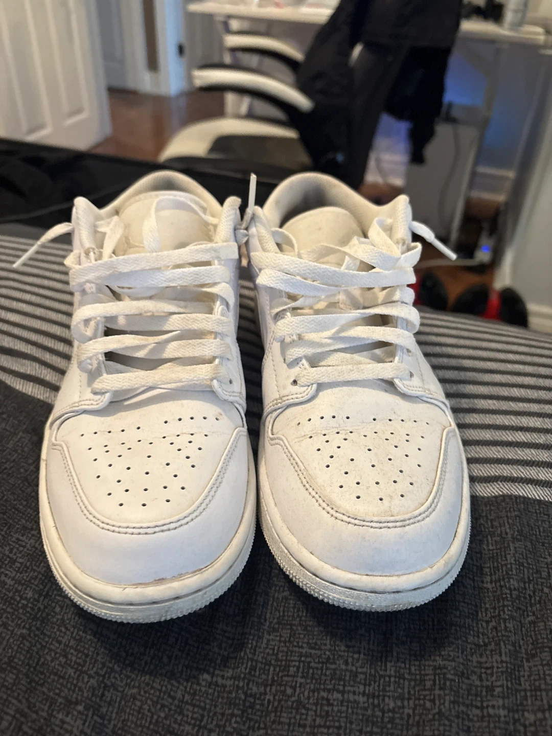 Selling a pair of Nike Air Jordan 1 Low sneakers in white. They're in used condition, but still have lots of life left! Perfect for everyday wear or hitting the court