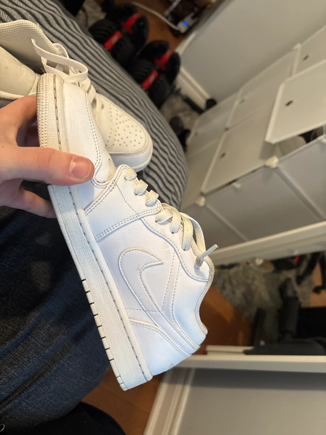 Selling a pair of Nike Air Jordan 1 Low sneakers in white. They're in used condition, but still have lots of life left! Perfect for everyday wear or hitting the court
