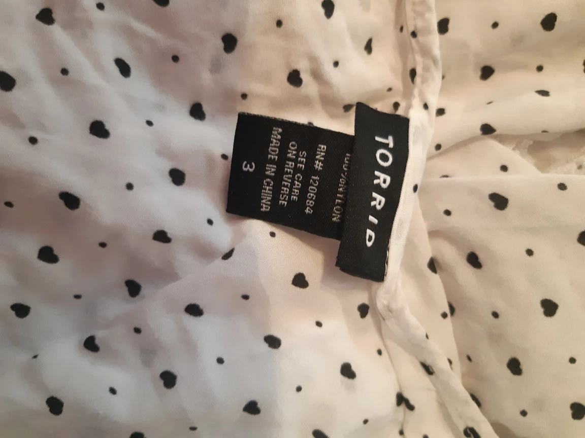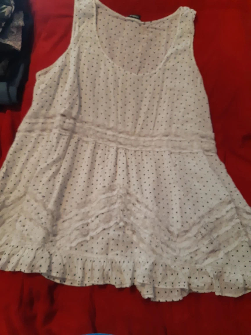 This is a cute Torrid sleeveless top in size 3. It features a polka dot pattern and a flowy design, perfect for a casual summer day. The material is lightweight and comfortable. Great condition!