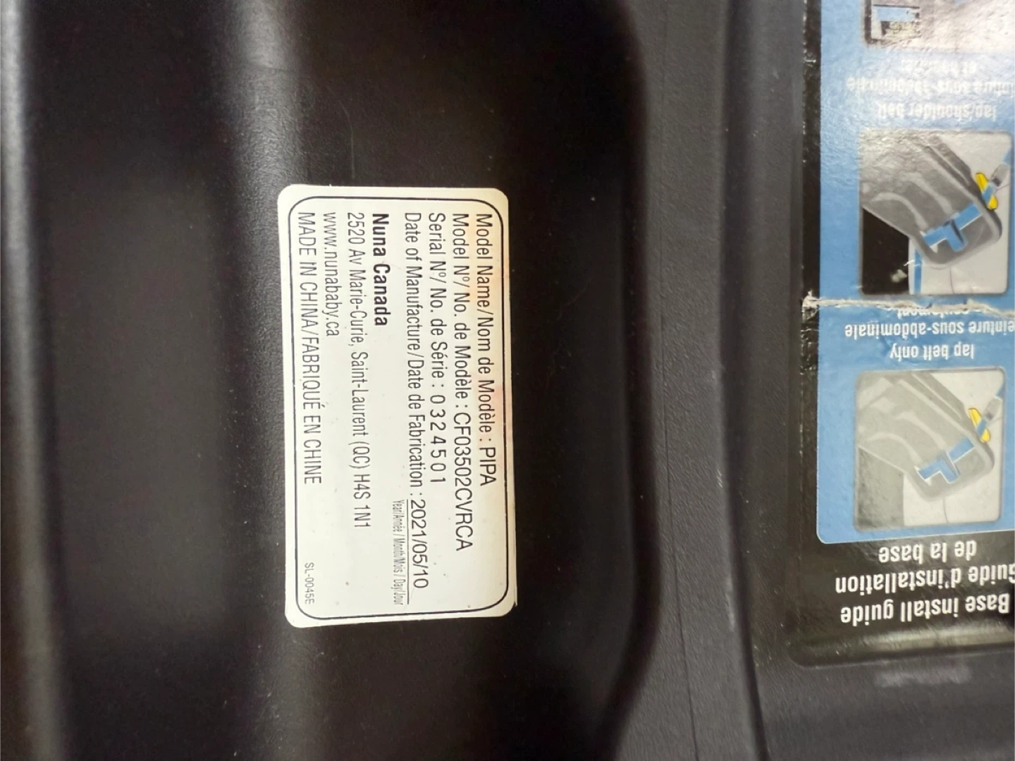 10Nuna Pipa Enfant Car Seat WITH Base for sale. Purchased in 2021, retails for $540 + tax. Selling for $250 given brand new harness and seat cover that we purchased this year (replaced it for second baby). Removable enfant insert is included. Some minor scratches on handle and side. Home pick up at Islington and Queensway. 5-point harness for maximum security; single-pull harness adjustment secure and simple 5-second install A rigid latch locks a car seat to a vehicle more securely than a typical flexible latch. Side impact protection provides full body side impact coverage and security. An integrated full-coverage canopy protects baby and their little peepers. Peek-a-boo mesh window provides airflow for baby and a bird’s eye view for you. Premium, micro-knit fabric keeps tiny ones cool in hot temperatures and toasty in cold weather terrain and creates a plush cushy comfort for baby. The removable infant insert fits the Nuna PEPP stroller. Distinctive, comfortable, contemporary design Revolutionary dream drape provides extra protection from the elements, and tucks neatly away in its secret compartment Compatible with the Nuna PEPP (adaptor sold separately), MIXX, IVVI, TAVO or DEMI grow stroller. True lock installation makes set up swift, simple and above all – safe Heavy-duty shell is super resilient yet ultra-lightweight - only 7.9 lbs! The comfy infant insert is removable for growing babies Removable, full coverage two position & protective UPF 50+ canopy with flip out eyeshade Installs rearward facing in a snap with the PIPA’s base The lightweight carry handle is ergonomically designed to tote with ease-ideal for city living and taxis as it can be installed with a vehicle seat belt no base needed All fabrics are machine washable. Aircraft certified to travel everywhere and beyond Expires 7 years from Date of Purchase - see image for manufacture date