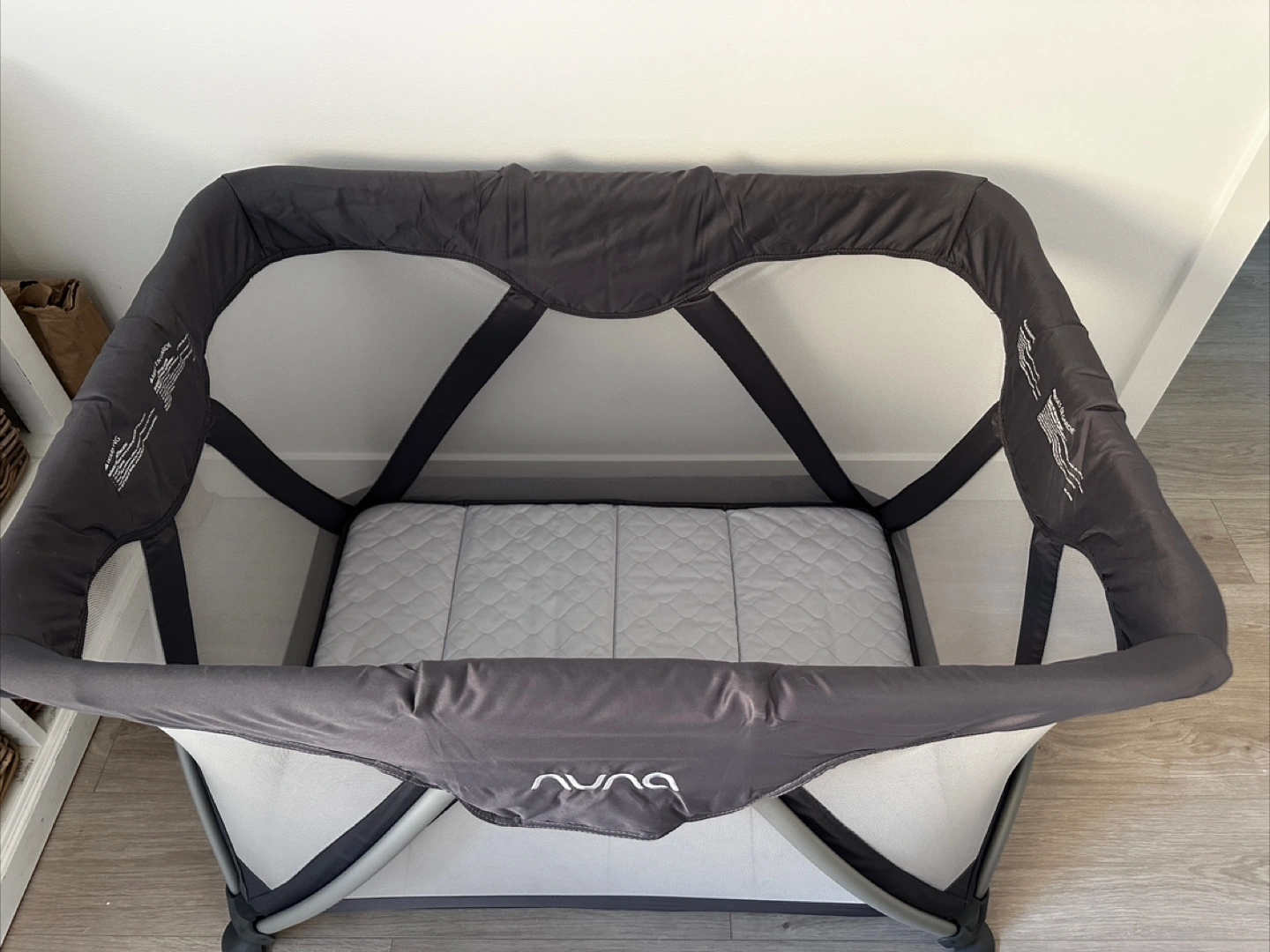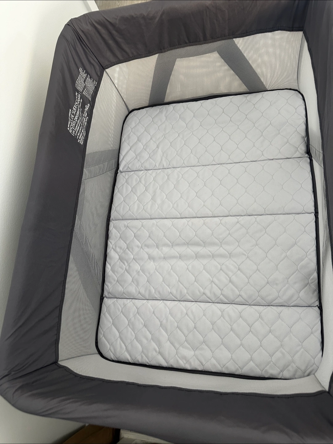 Portable crib, easy to assemble and disassemble. Grey fabric. Includes carrying bag. * Folds easily with one hand; unique zigzag legs pop playard open quickly and easily * Ventilated triple layered mesh mattress pulls away both heat and humidity; zip-off design is machine washable and dryer safe * Ventilated mattress panels are removable for deep cleaning * Quick and easy bassinet attachment * Chic look won't clutter family room * Sturdy aluminum zigzag frame * Skid-proof feet * Carry bag included * Product size(assembled): 41.3"w x 29.5"d x 30.7"h * Product size (folded): 13"w x 11"d x 31.5"h * Product weight (without bassinet): 22 lbs.