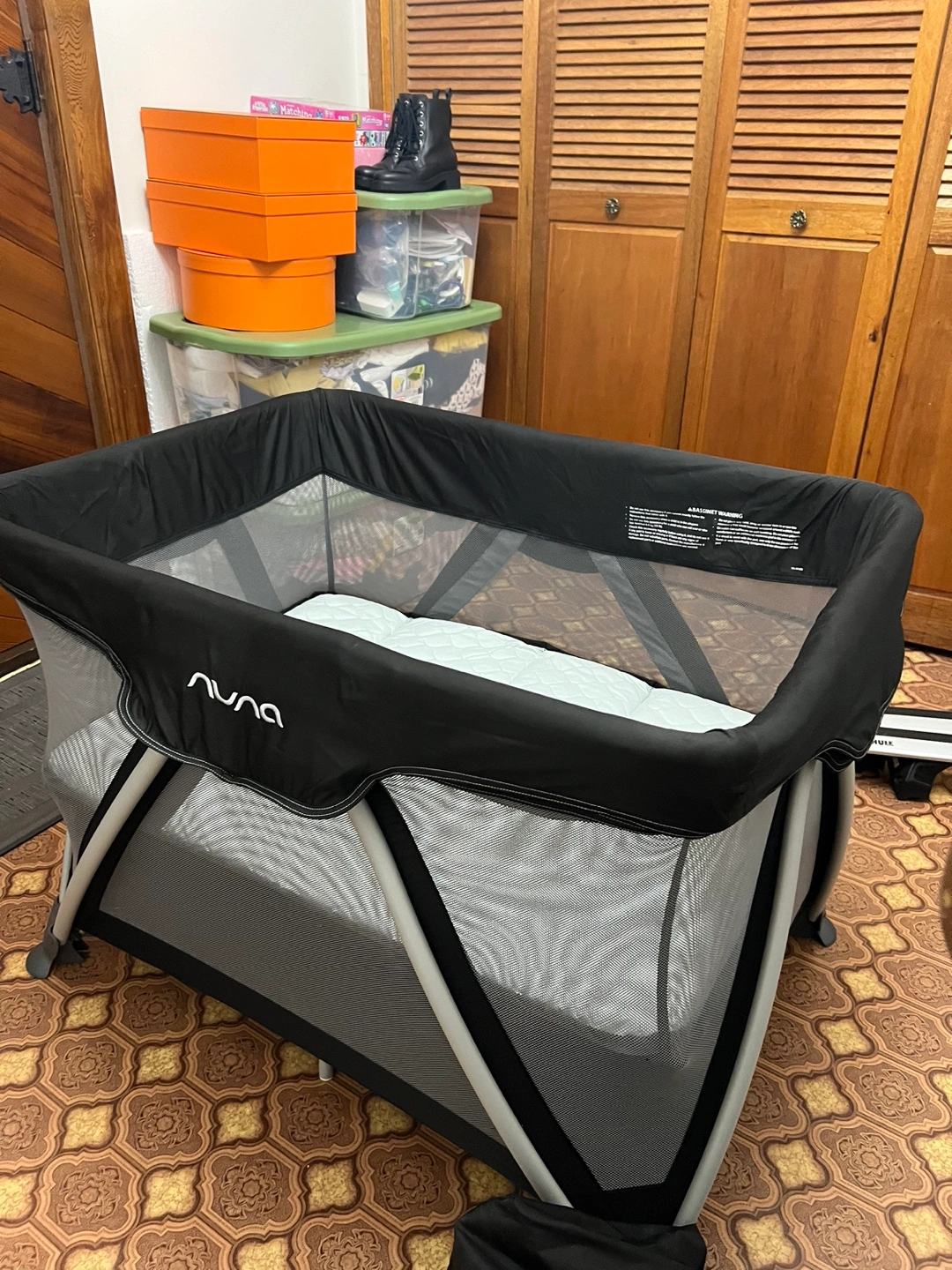 Portable crib, easy to fold and store. Includes mattress. Great for travel.