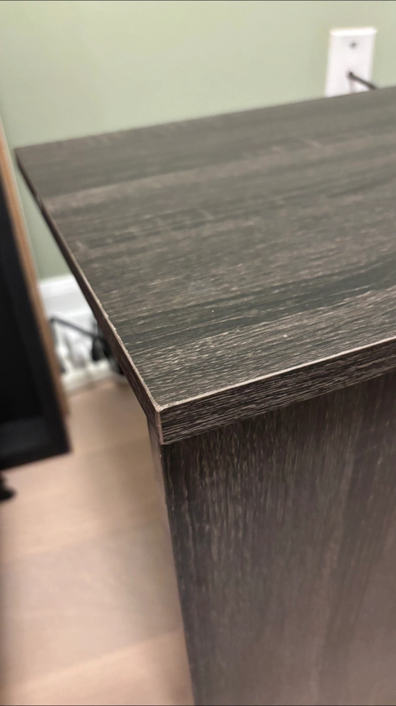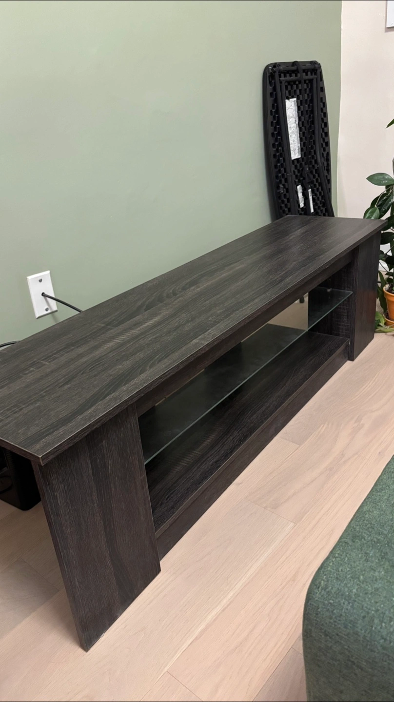 Modern TV stand. Dark grey finish. Glass shelf. Good condition with slight wear. Long and low profile. Was used for a 55" tv.