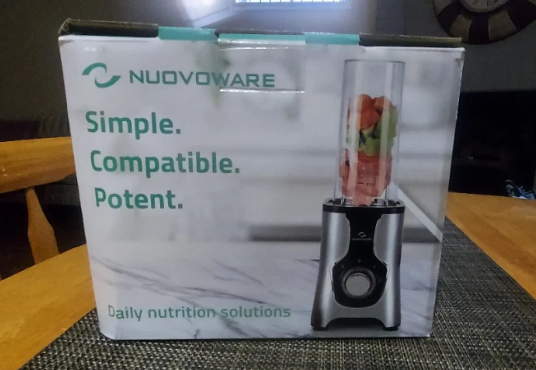 34Selling a Nuovoware portable blender, perfect for shakes and smoothies! It comes with a 6-edge blade. This smoothie blender has a 600W motor and includes two 20oz portable bottles. It features 3 speeds for juice and protein drinks. Everything included in good condition with box.