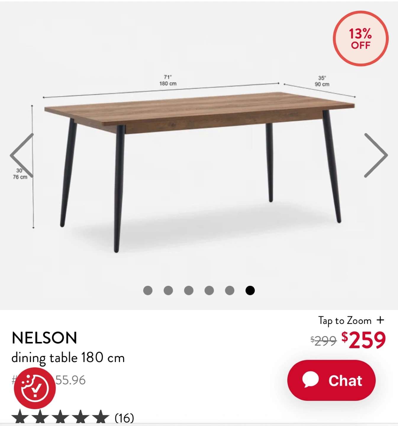 Selling a Nelson dining table, measuring 180 cm in length. It's in great shape and ready for a new home! The original listing price was $259 that we bought it for, and itβs only been used for 3 months. No scratches. No dents. Rarely sat at and was mostly used as decoration. We are selling it for $140 and are hoping to find it a very nice and loving home. π‘