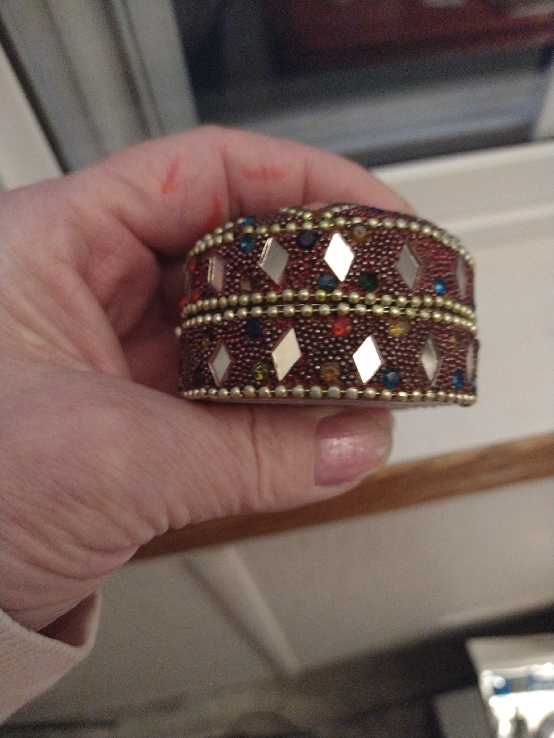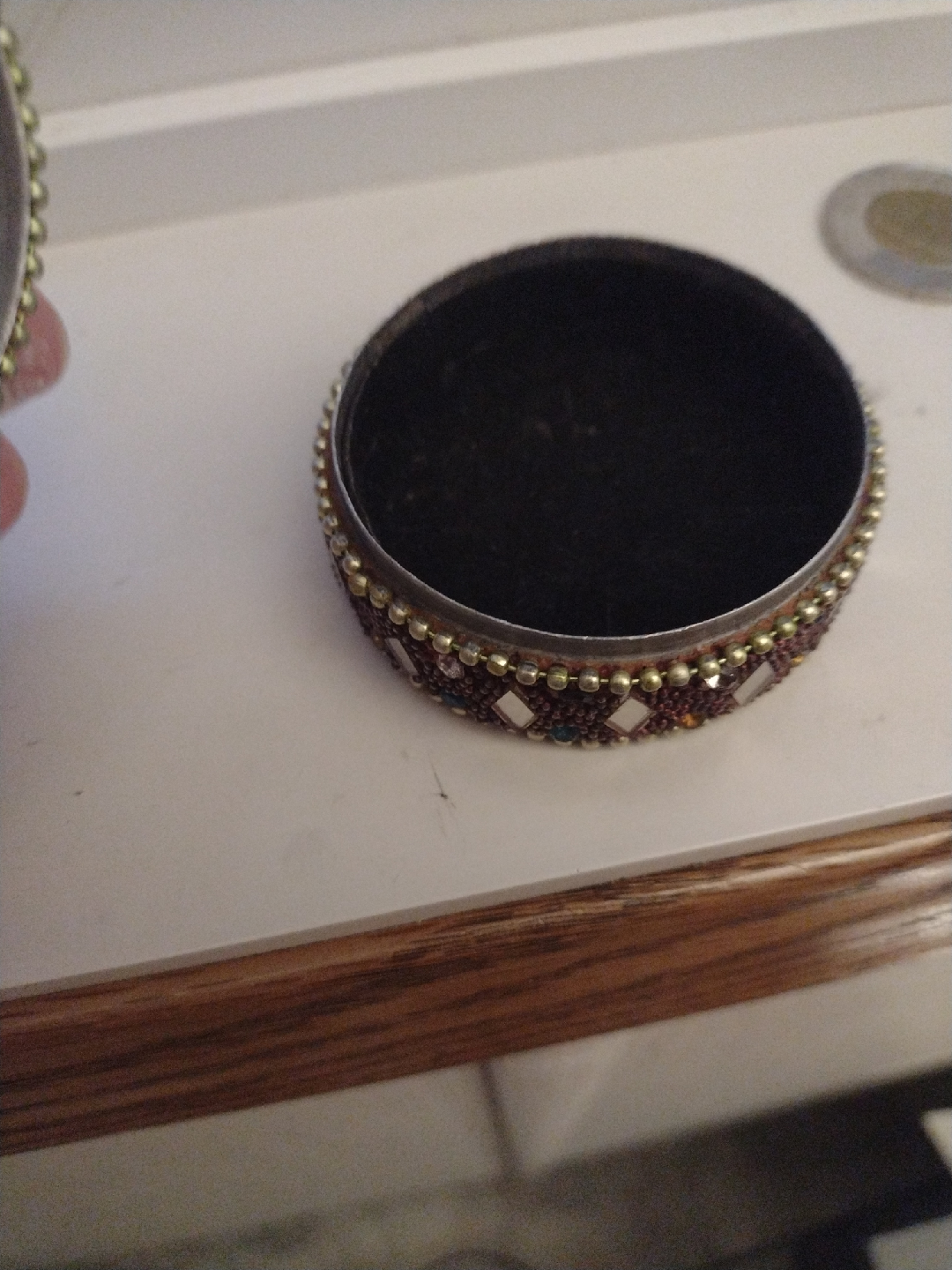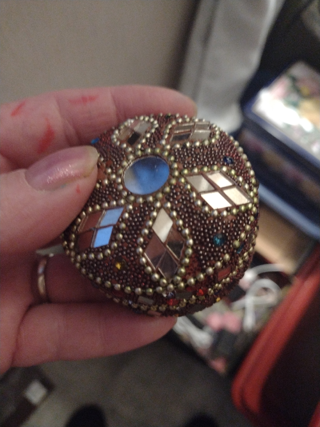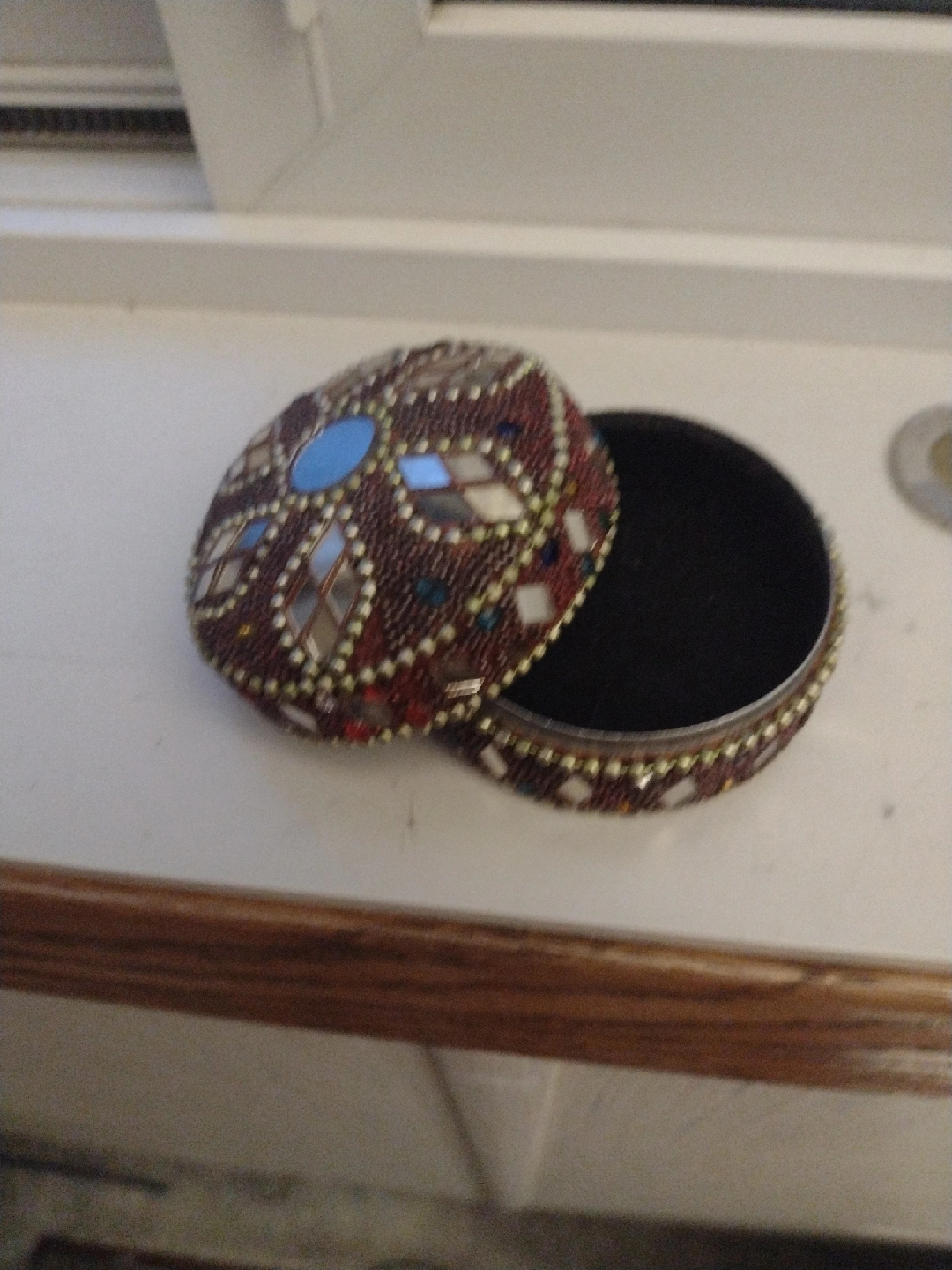 A lovely, decorative trinket box with intricate beadwork and mirrored accents. The inside is lined with a soft, dark material. Perfect for storing small jewelry or keepsakes!