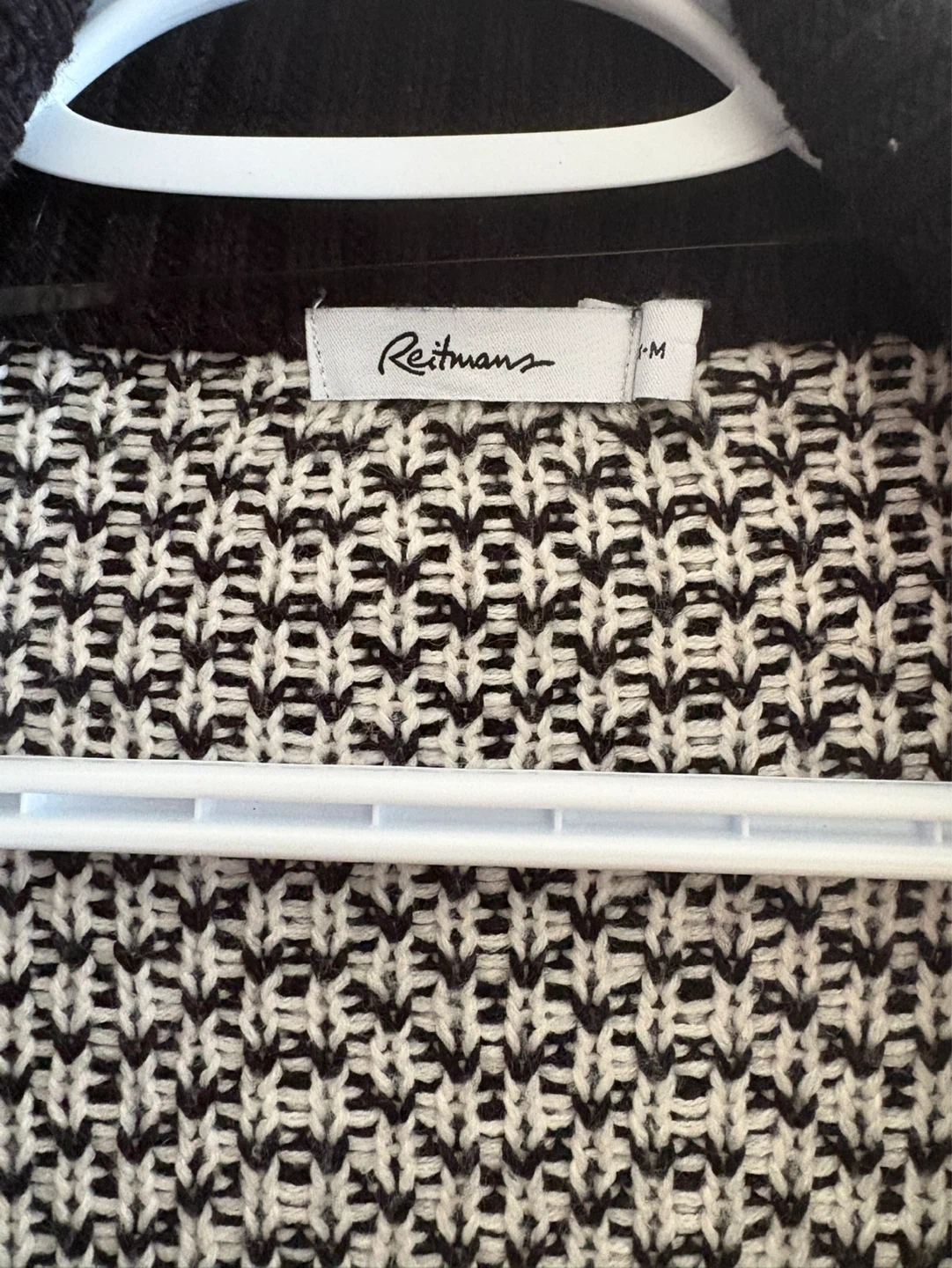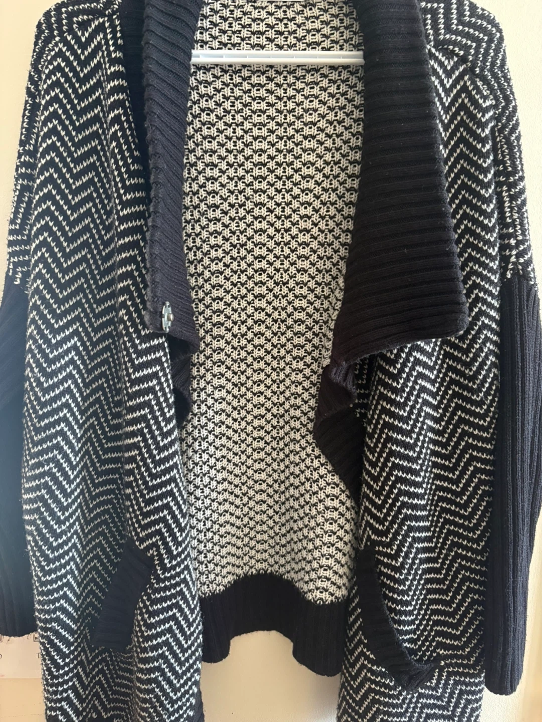 This Reitmans cardigan is black and white with a chevron pattern on the sleeves and a textured knit on the body. It's a size medium and has an open front with a single button closure. Great for layering!