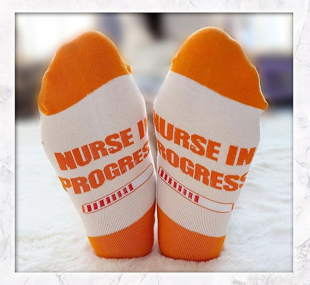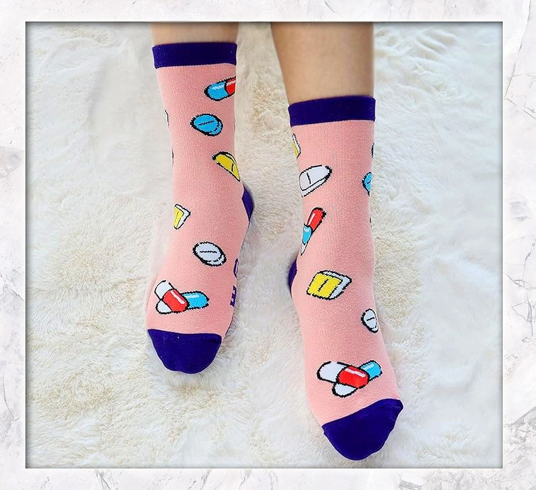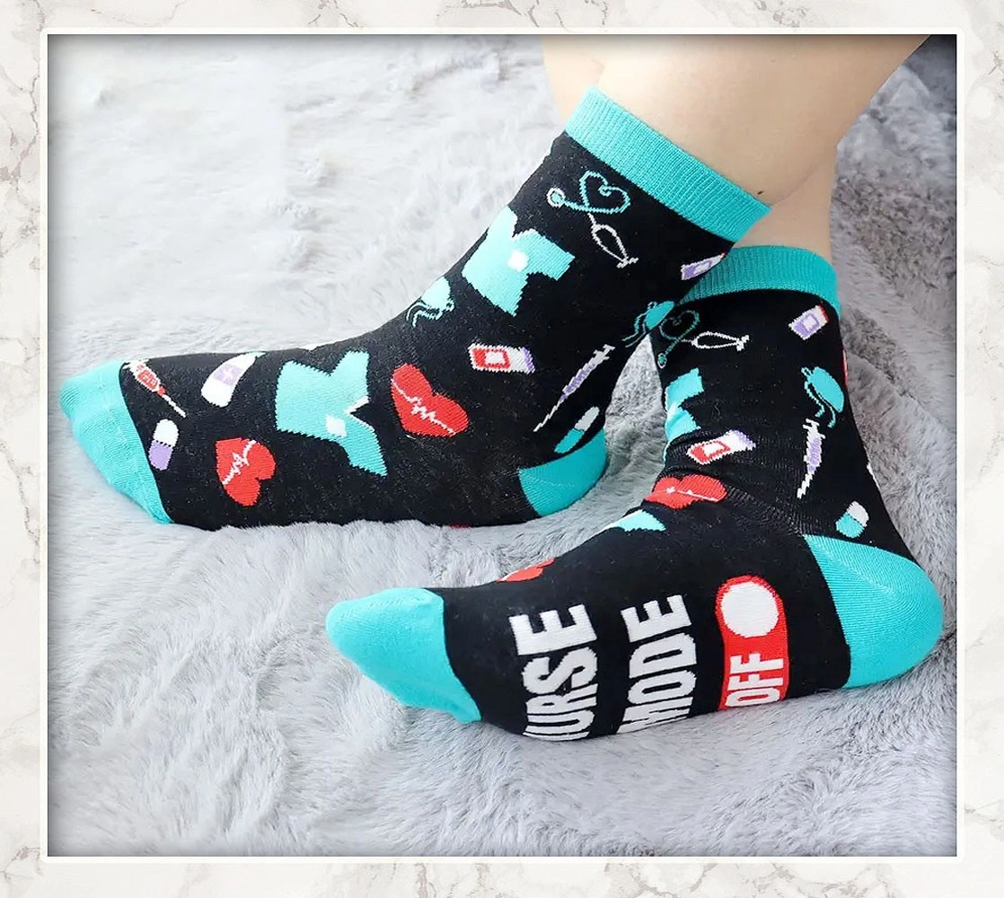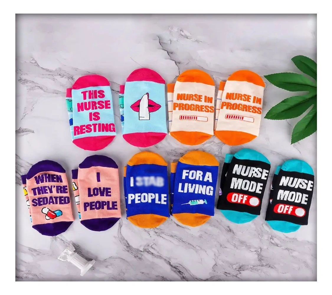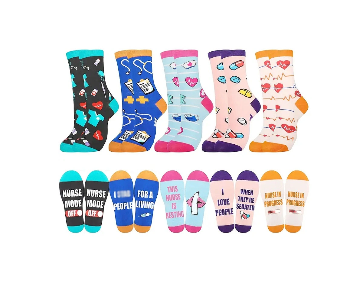 SOLD AS A SET. 5 pairs of fun nursing socks Made of 80% Cotton, 15% Acrylic, 5% Spandex Best for women size US 5 to 6 Good stretchy fit but no compression effect Fun statements at the soles Vibrant, eye catching colour These are not medical compression socks, just ordinary cotton socks All new, never used, no damages