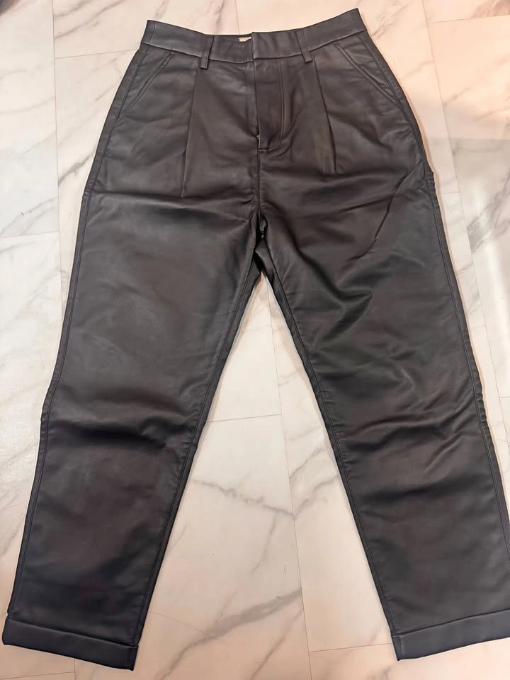 A modern take on the essential trouser, these are built with smooth and supple vegan leather accented with front pleats. High-waisted and with room to move, they're supremely comfortable and effortlessly stylish. Pair them with the Survey Boxy Chore Coat for a head-to-toe vegan leather look that will turn heads. 100% polyurethane. Vegan leather. Pleats at front waistband.