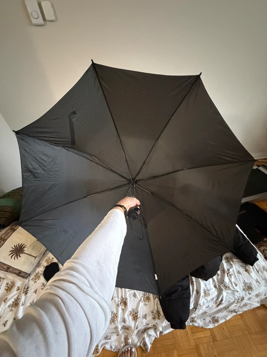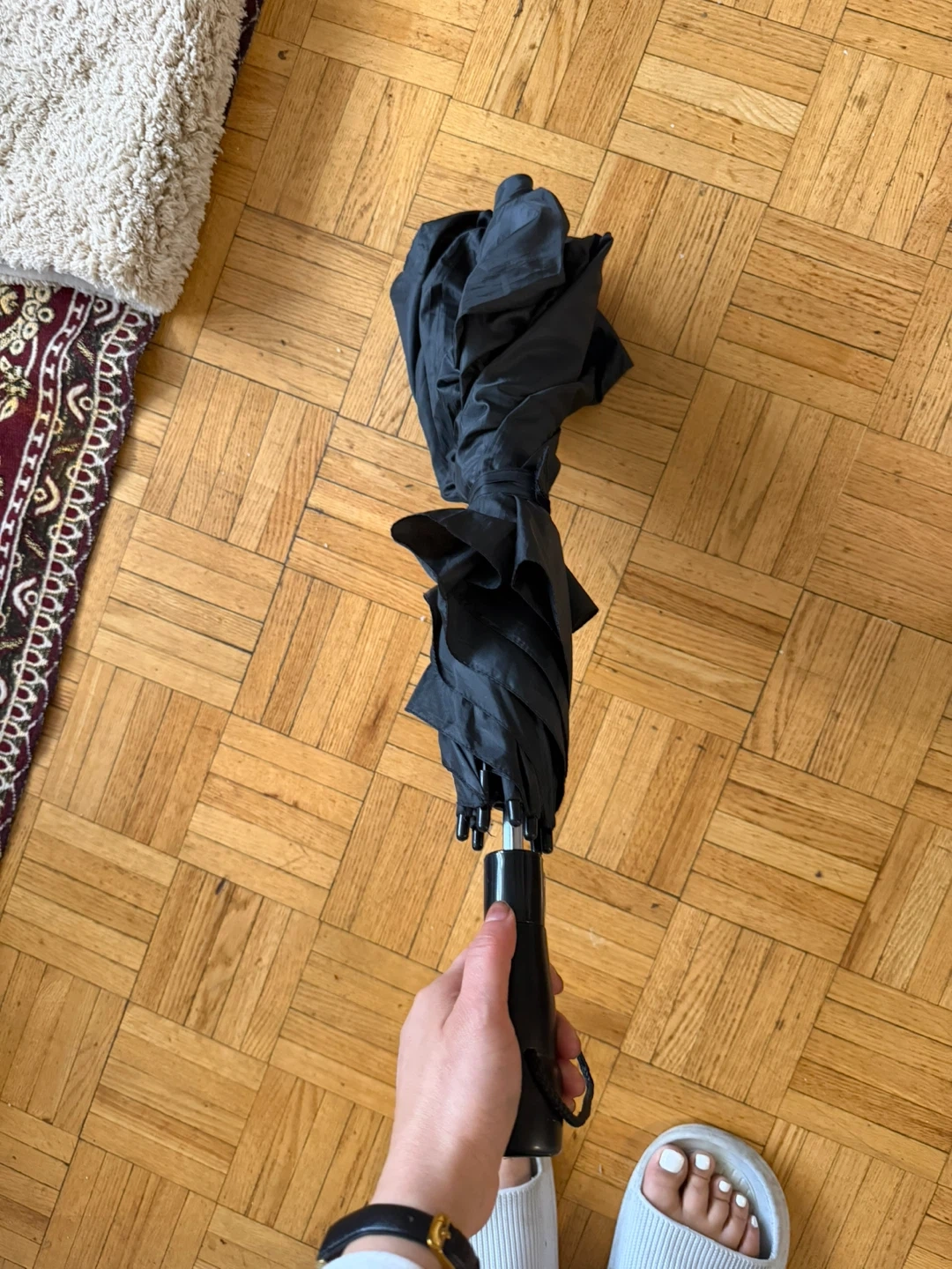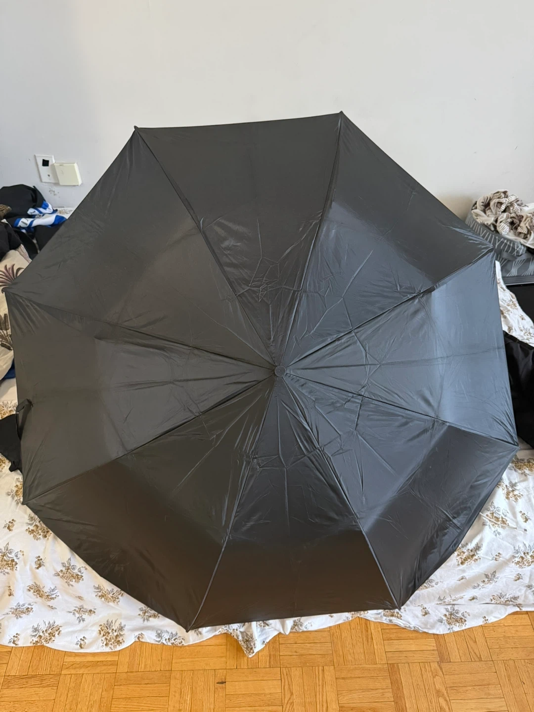 A handy black folding umbrella, perfect for keeping in your bag or car. It's lightweight and easy to operate, providing good coverage from the rain. This umbrella is a practical choice for unpredictable weather days. at least 3 people can fit this umbrella