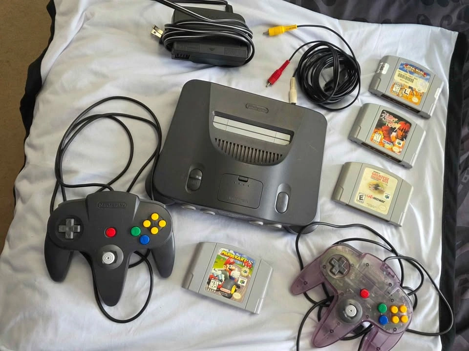 Relive the classics with this complete N64 starter set. Perfect for retro gamers and collectors alike. Console: Original charcoal gray Nintendo 64 (N64) with the required black Jumper Pak installed. 4 Games Included: Fighters Destiny (Unique 3D combat), Mario Kart 64 (Legendary racing), Star Wars: Rogue Squadron, Midway's Greatest Arcade Hits. Accessories: 1 Atomic Purple transparent controller, 1 classic gray controller, AC power adapter, and AV cables. Condition: Pre-owned and tested; all game labels are original and in good condition.