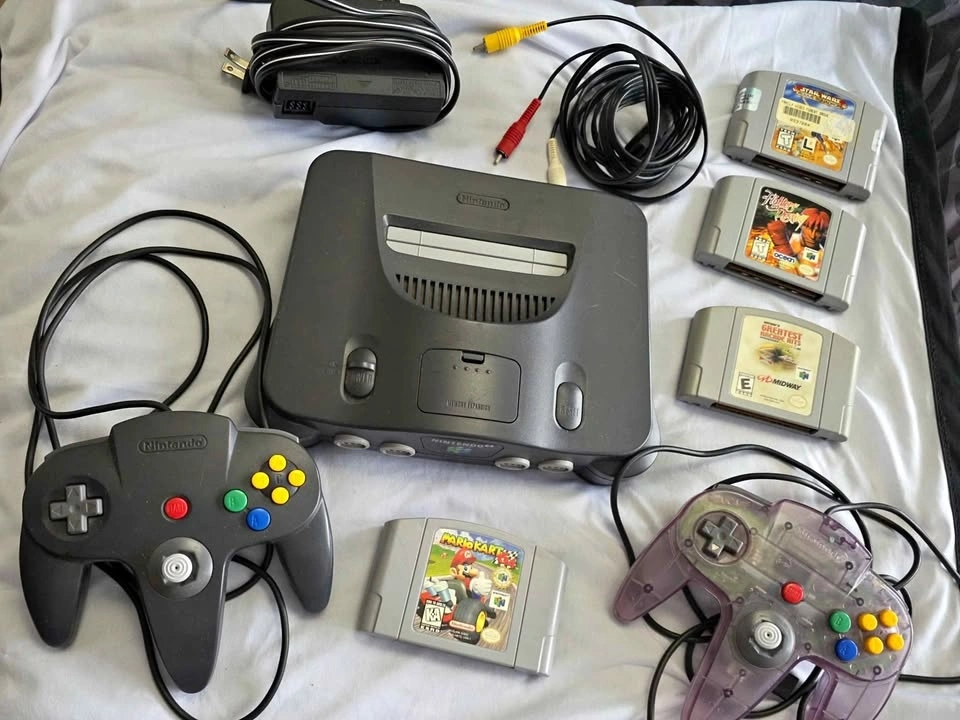 Relive the classics with this complete N64 starter set. Perfect for retro gamers and collectors alike. Console: Original charcoal gray Nintendo 64 (N64) with the required black Jumper Pak installed. 4 Games Included: Fighters Destiny (Unique 3D combat), Mario Kart 64 (Legendary racing), Star Wars: Rogue Squadron, Midway's Greatest Arcade Hits. Accessories: 1 Atomic Purple transparent controller, 1 classic gray controller, AC power adapter, and AV cables. Condition: Pre-owned and tested; all game labels are original and in good condition.