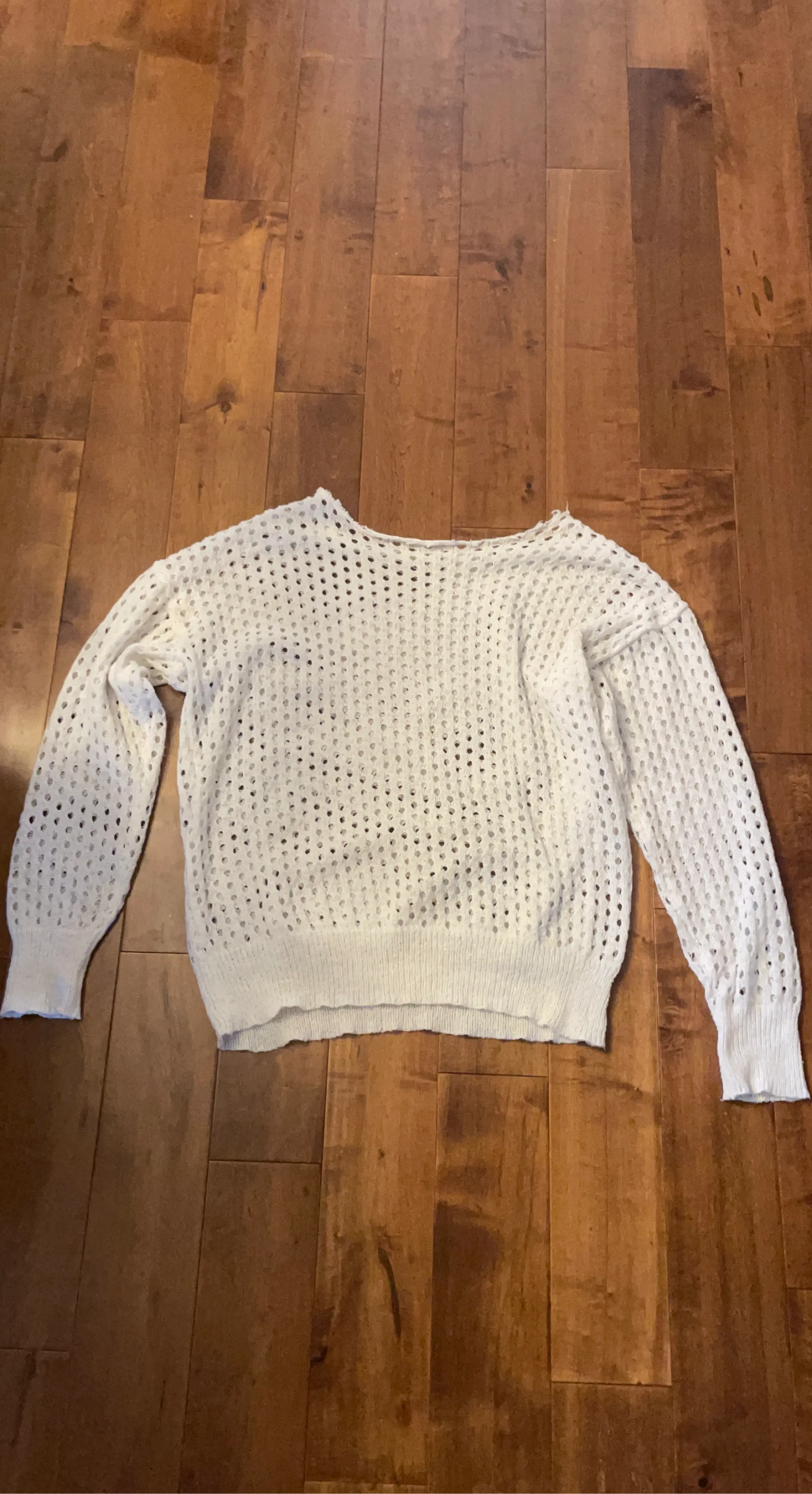 Cream-coloured crochet knit sweater with a relaxed fit. It has a scooped neckline and long sleeves with ribbed cuffs and hem. This sweater's open knit design makes it a great layering piece.