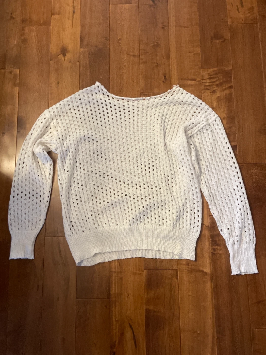 Cream-coloured crochet knit sweater with a relaxed fit. It has a scooped neckline and long sleeves with ribbed cuffs and hem. This sweater's open knit design makes it a great layering piece.