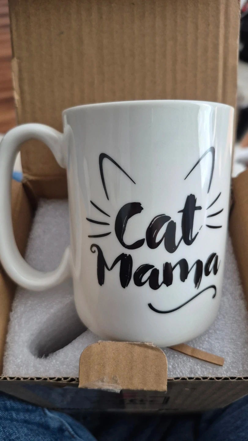 White ceramic mug with 'Cat Mama' in black script and cat ears design. It's a standard mug size. This mug would be great for enjoying your morning coffee or tea!