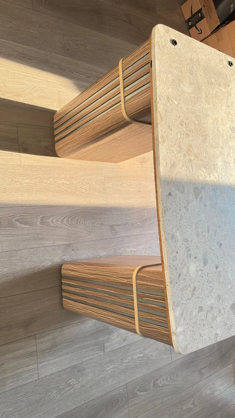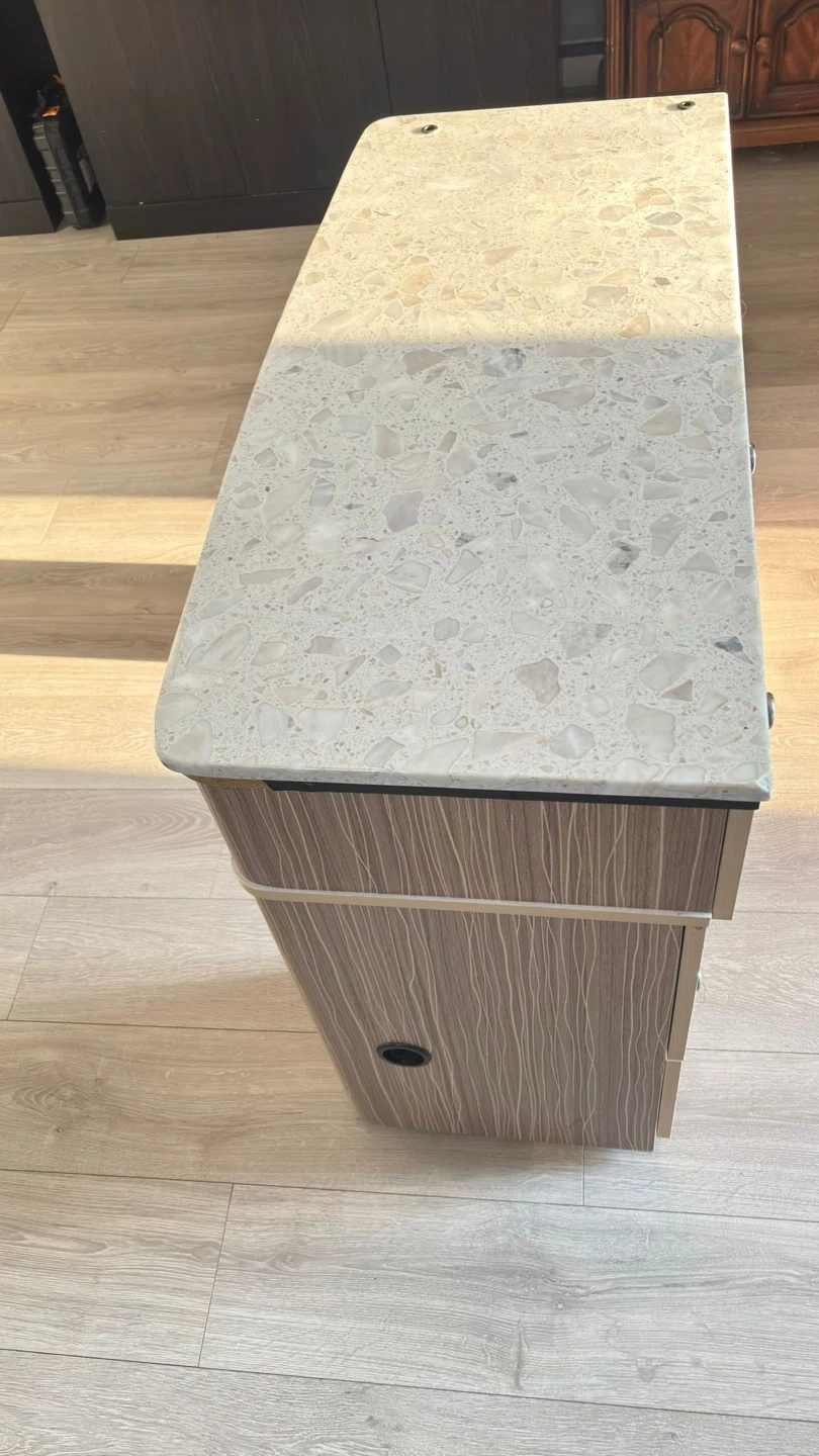 Selling a manicure table with a matching chair. The table features a speckled stone-like top and wood-look drawers and shelving. Great for a home salon setup!