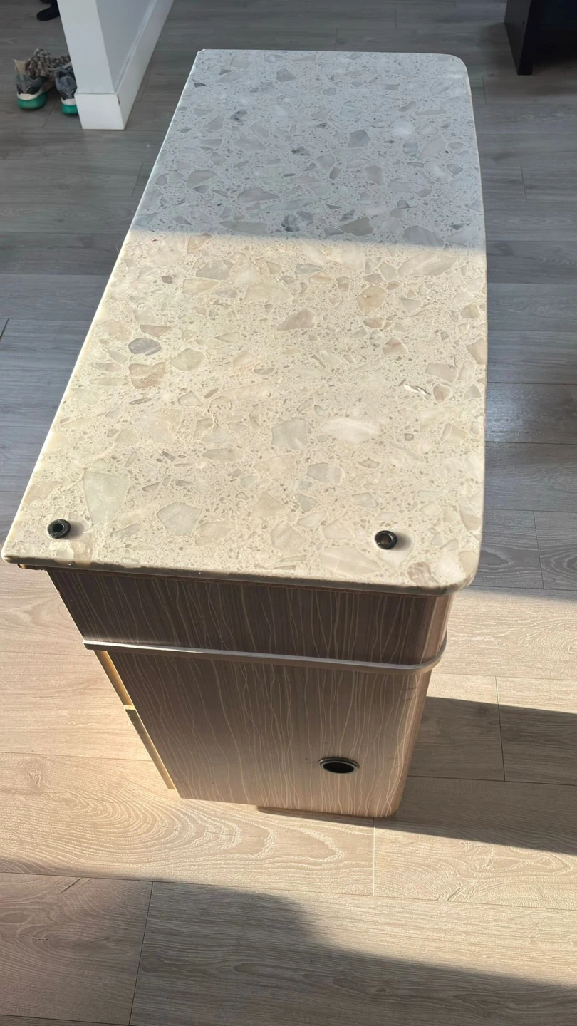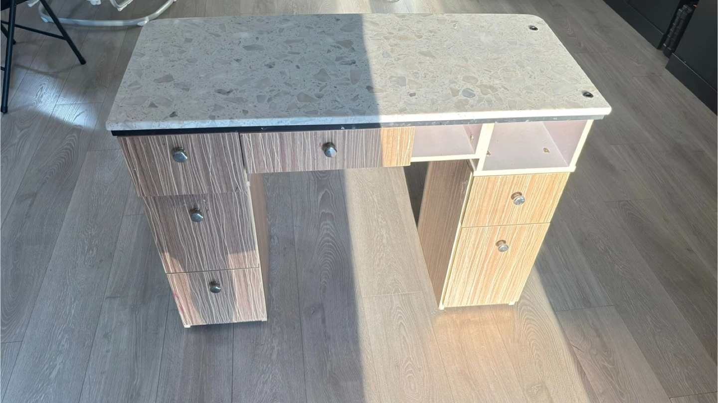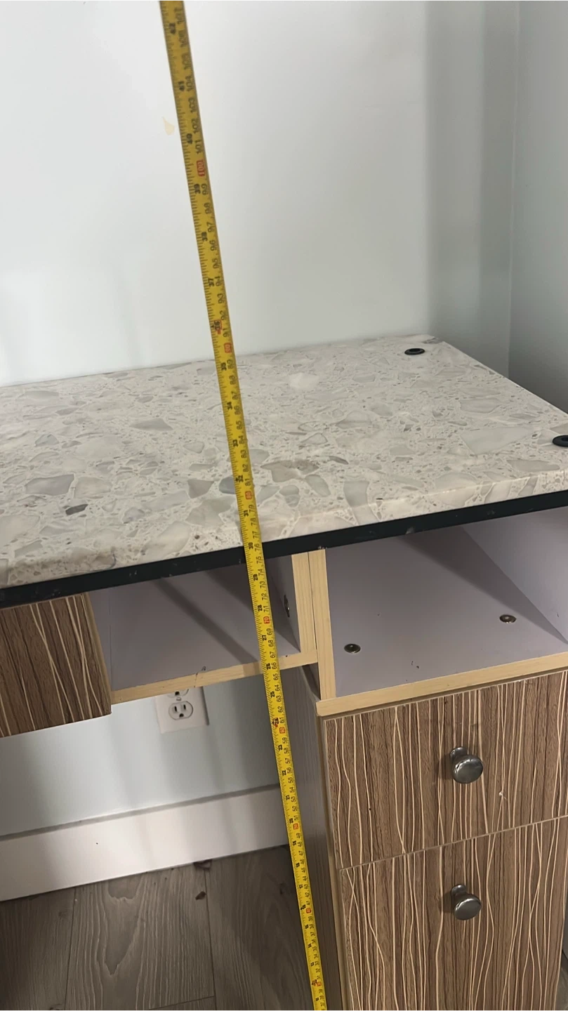 Selling a manicure table with a matching chair. The table features a speckled stone-like top and wood-look drawers and shelving. Great for a home salon setup!