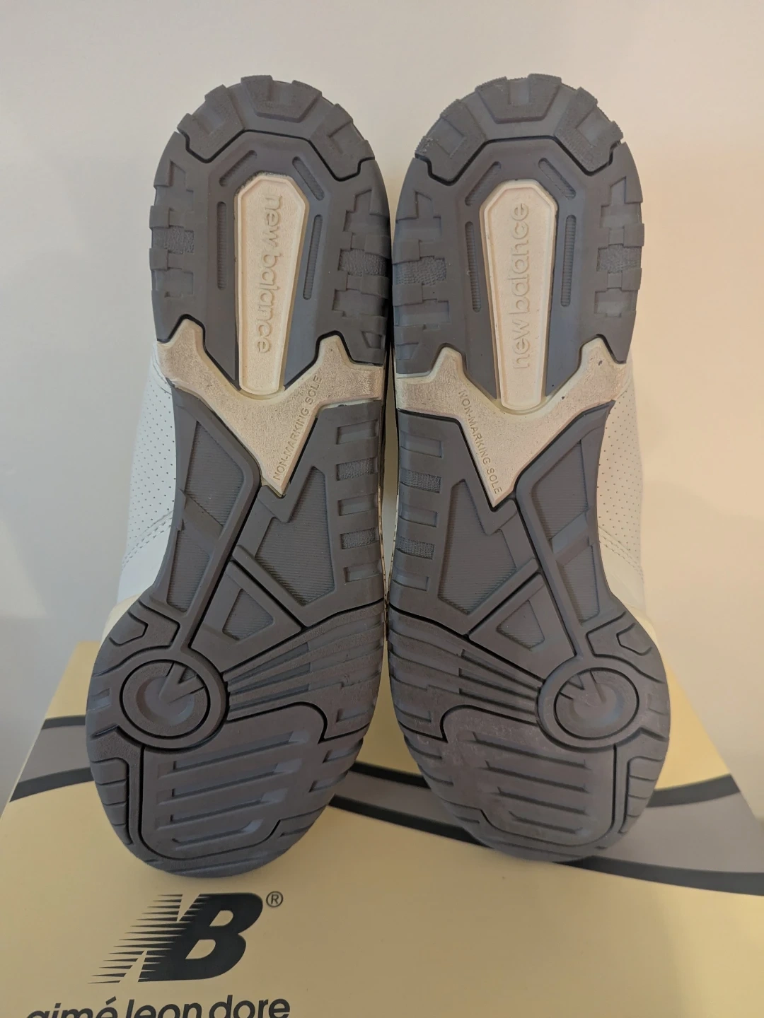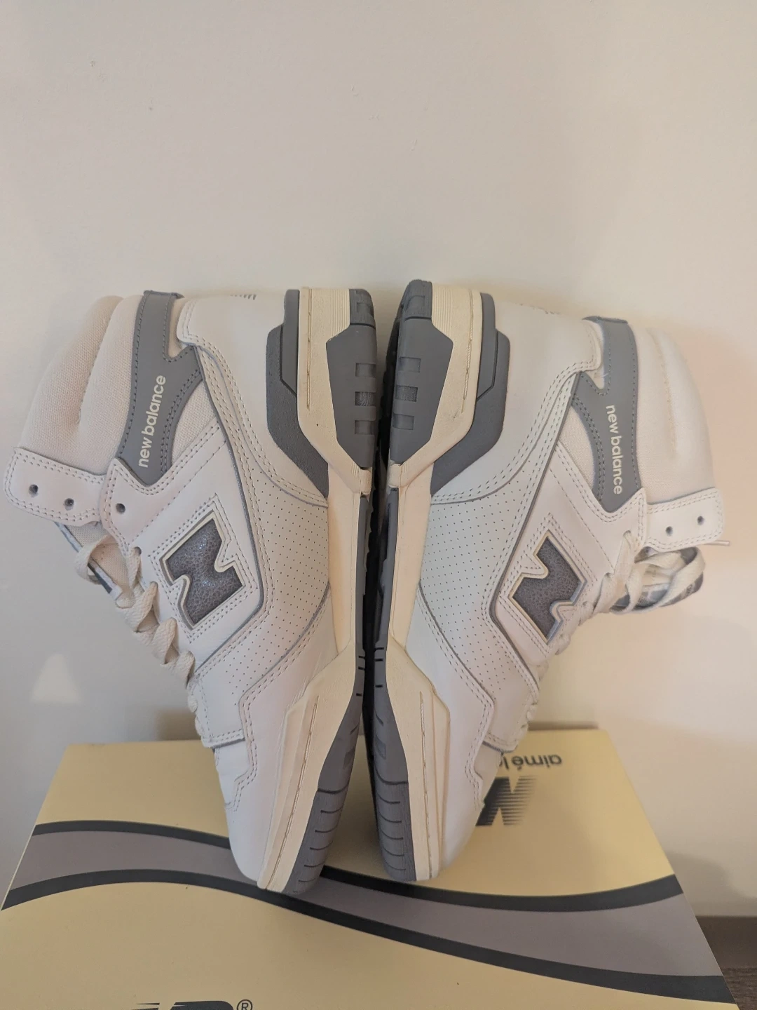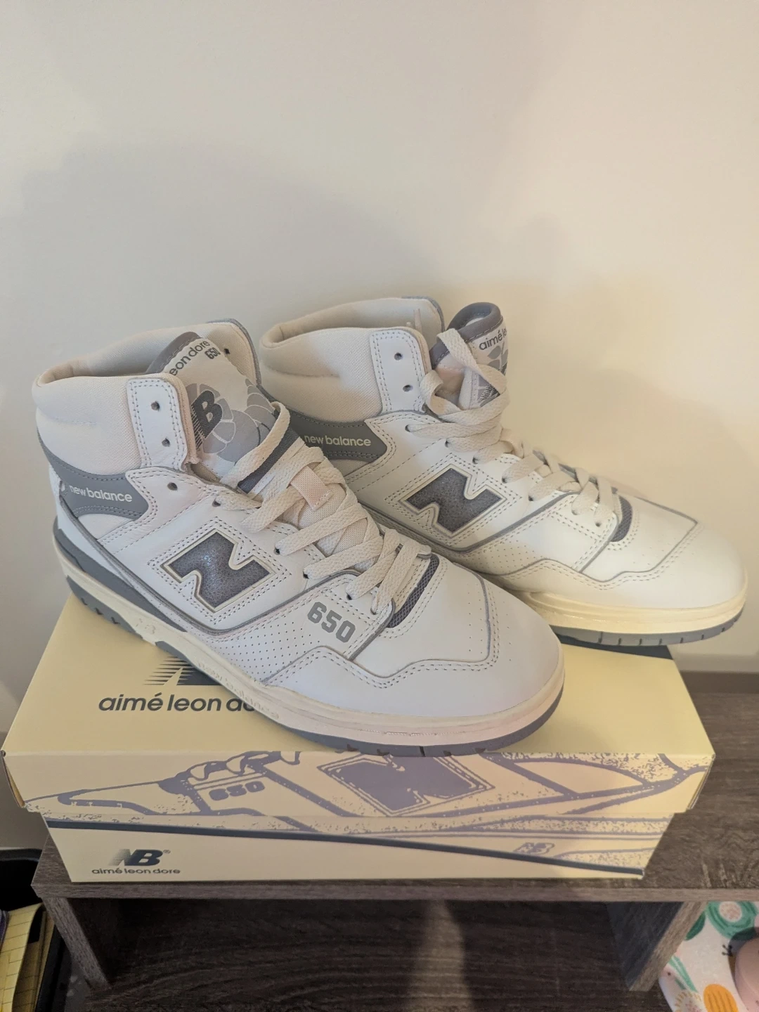 A pair of New Balance Aimé Leon Dore 650 high-top sneakers in white and grey. These shoes feature a leather and textile construction with a rubber sole. They come with the original box.