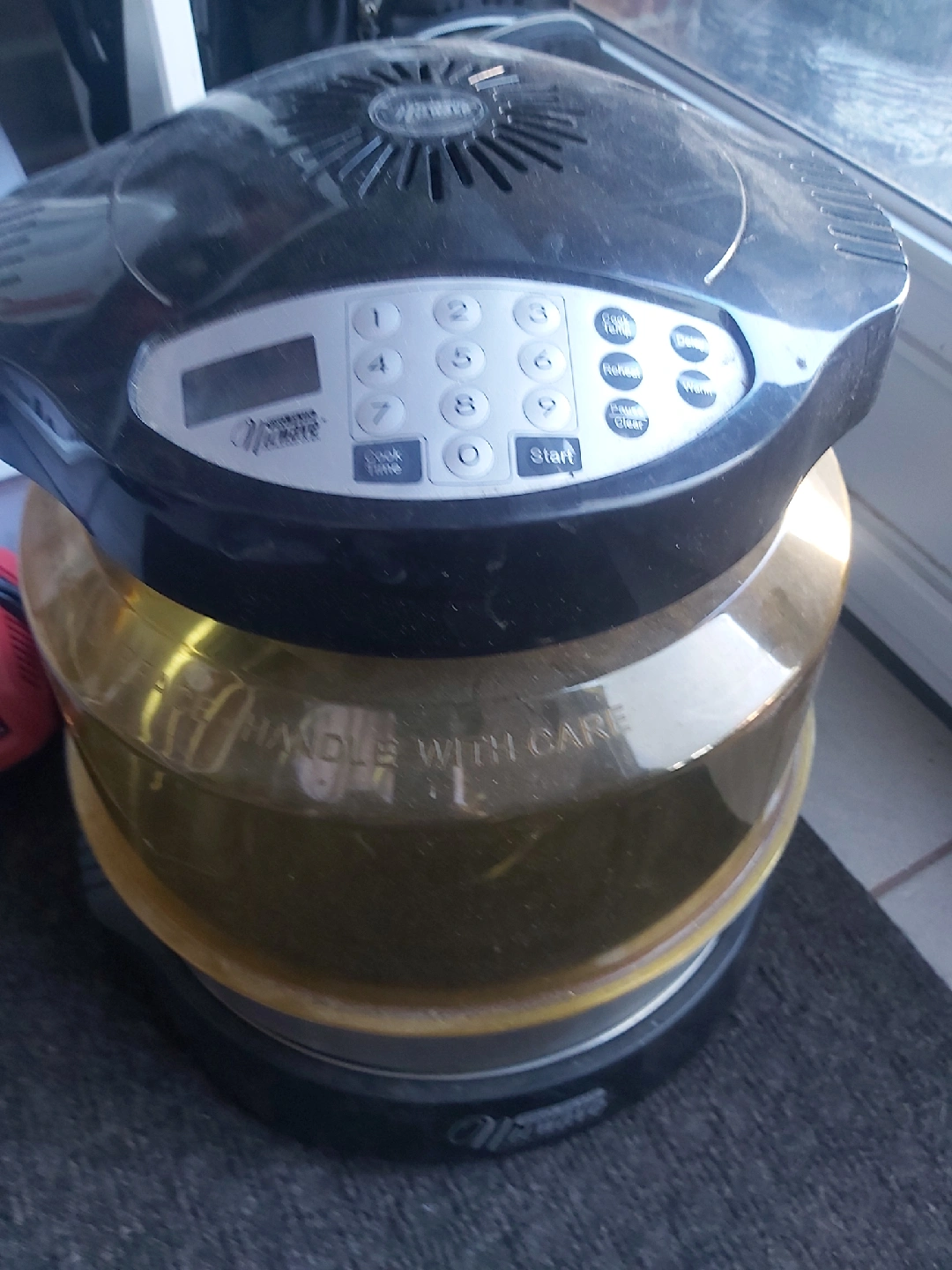 161Selling a used NuWave Pro Plus Infrared Oven. It has a digital control panel with buttons for cook time, temp, reheat, delay, and warm. The bowl is transparent and says 'Handle with Care' and 'Hot Surface Handle'.