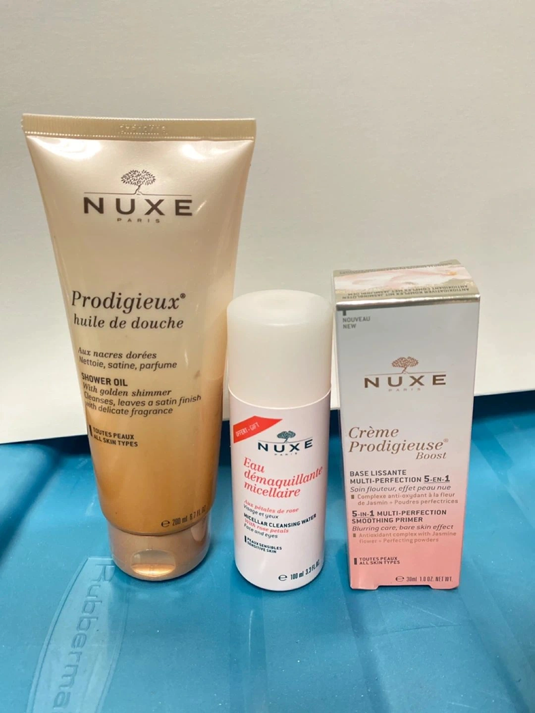 111Selling 1 Nuxe Pridigieux Shower Oil with gold shimmer, 1 Micellar Cleansing Water, and 1 Crème Prodigiuse Multi perfection Smoothing Primer. All 3 New. *Please check out all my other ads for skin care and make up. Thanks