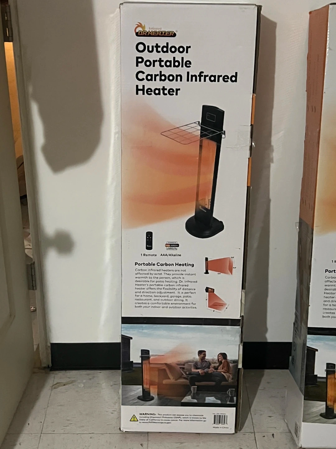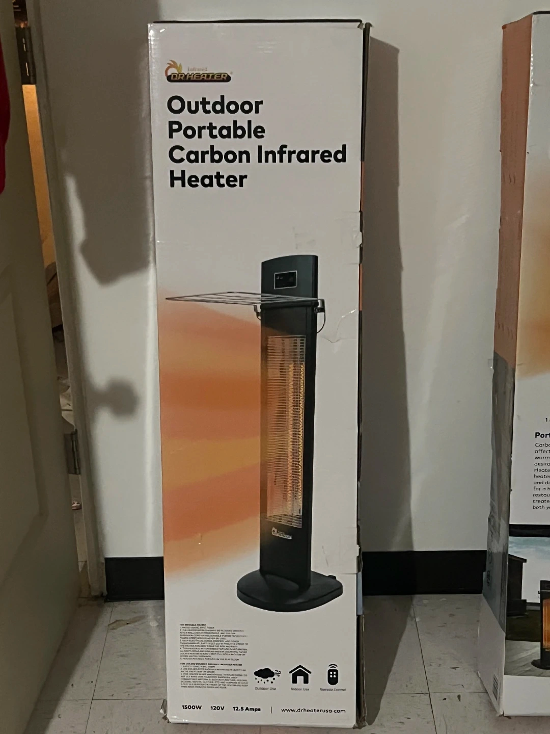 This is a DR. HEATER outdoor portable carbon infrared heater. It provides instant and even heat, unaffected by wind. The heater has a 1500W power output and operates at 120V with 12.5 Amps. It includes a remote control.