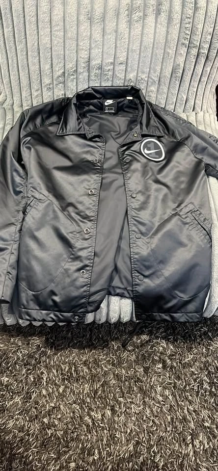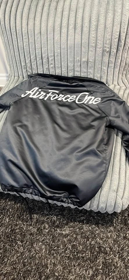 Sleek Nike Air Force One coach jacket. Has the classic Nike swoosh logo on front and big Air Force One graphic on back. Size small. Black color. Made in Vietnam.