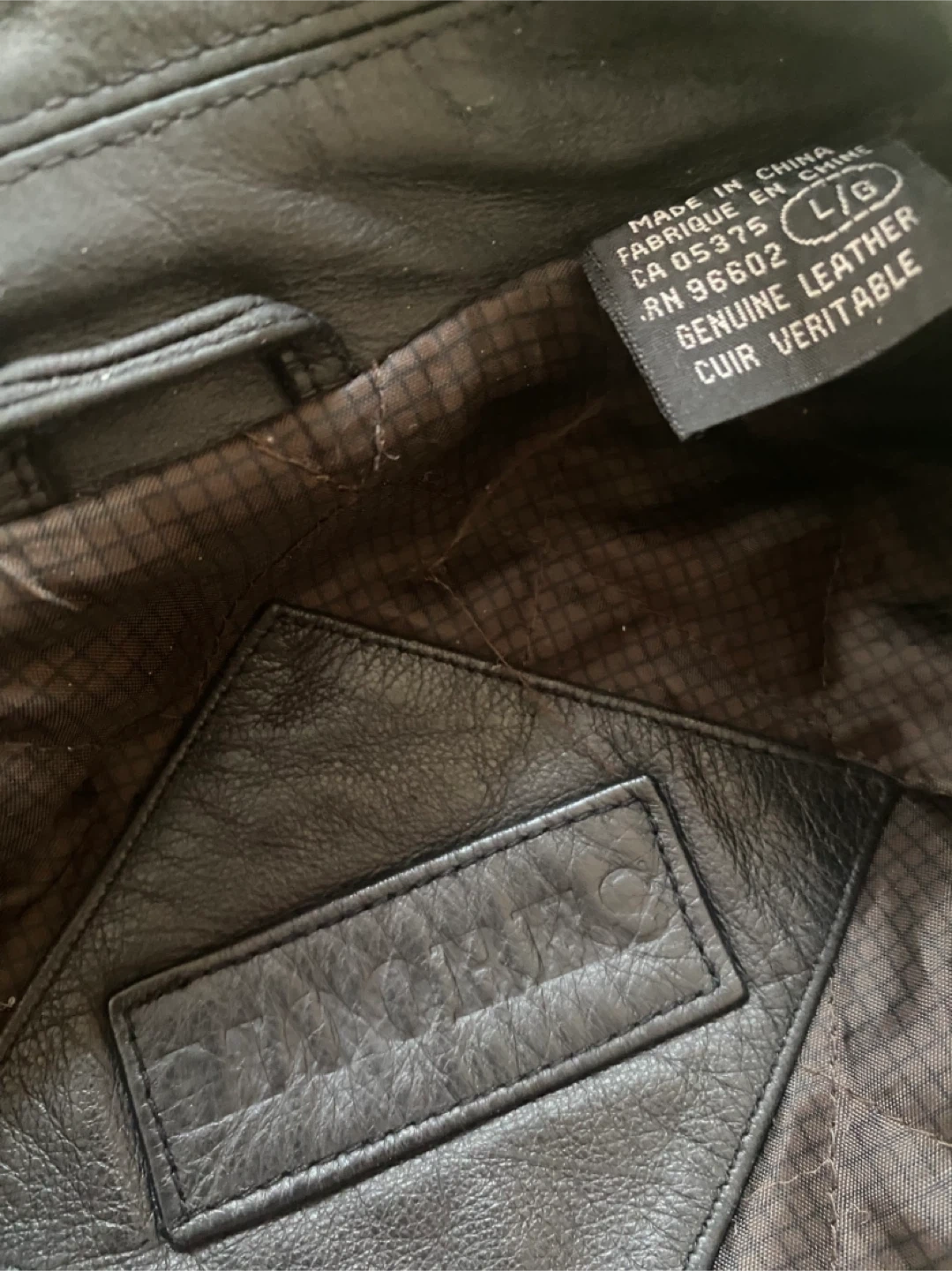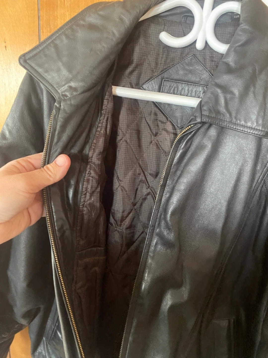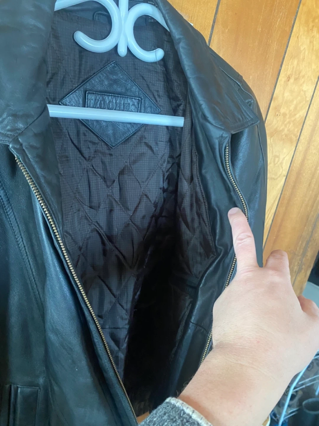 A classic black genuine leather jacket. It features a quilted lining and a zipper closure. Size is L/G.