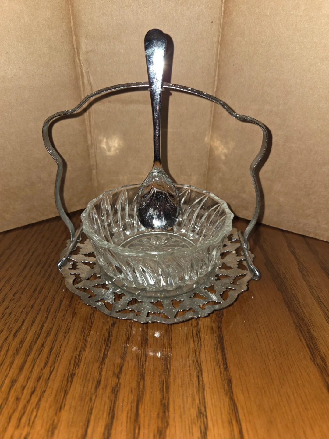 This vintage-style serving bowl features a clear, textured glass insert set in a decorative metal stand. It comes with a matching metal spoon, perfect for serving condiments or small dishes. The metalwork has an ornate, filigree-like edge on the base.