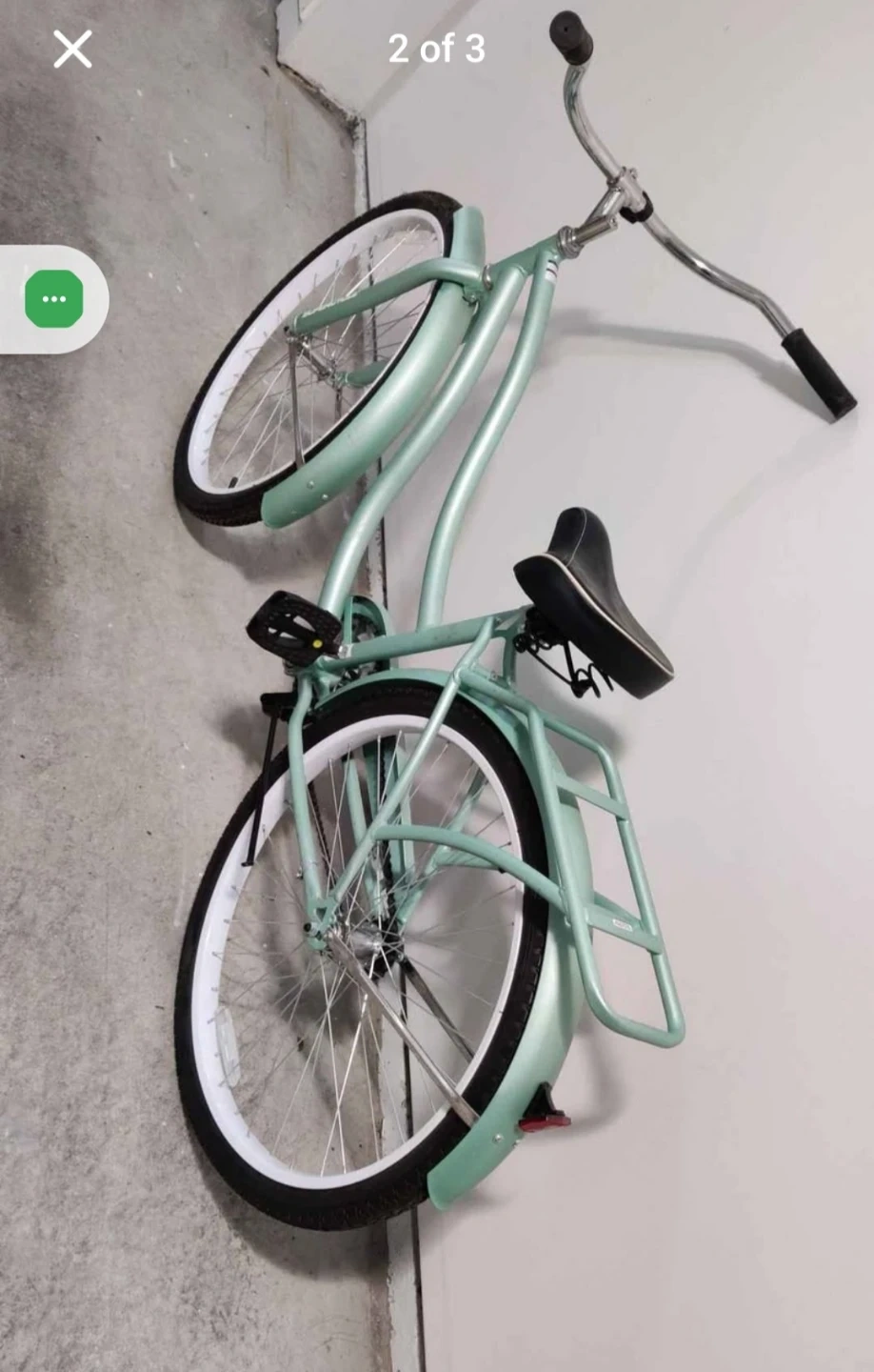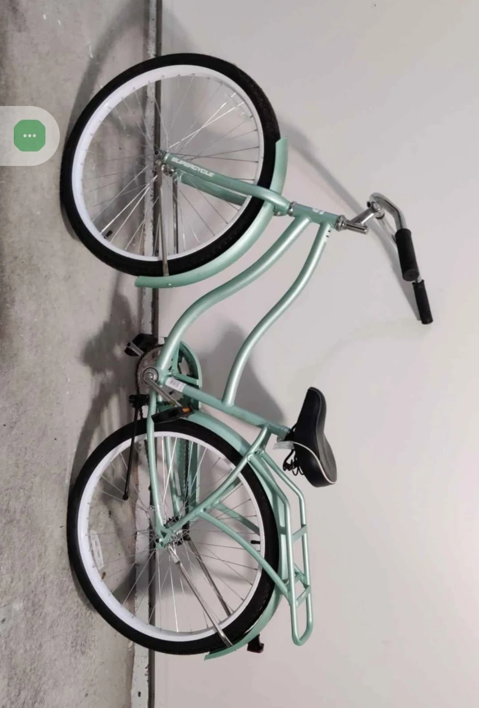 This Supercycle cruiser bike is a lovely mint green colour. It features a comfortable seat and a rear rack for carrying belongings. Perfect for leisurely rides around town!