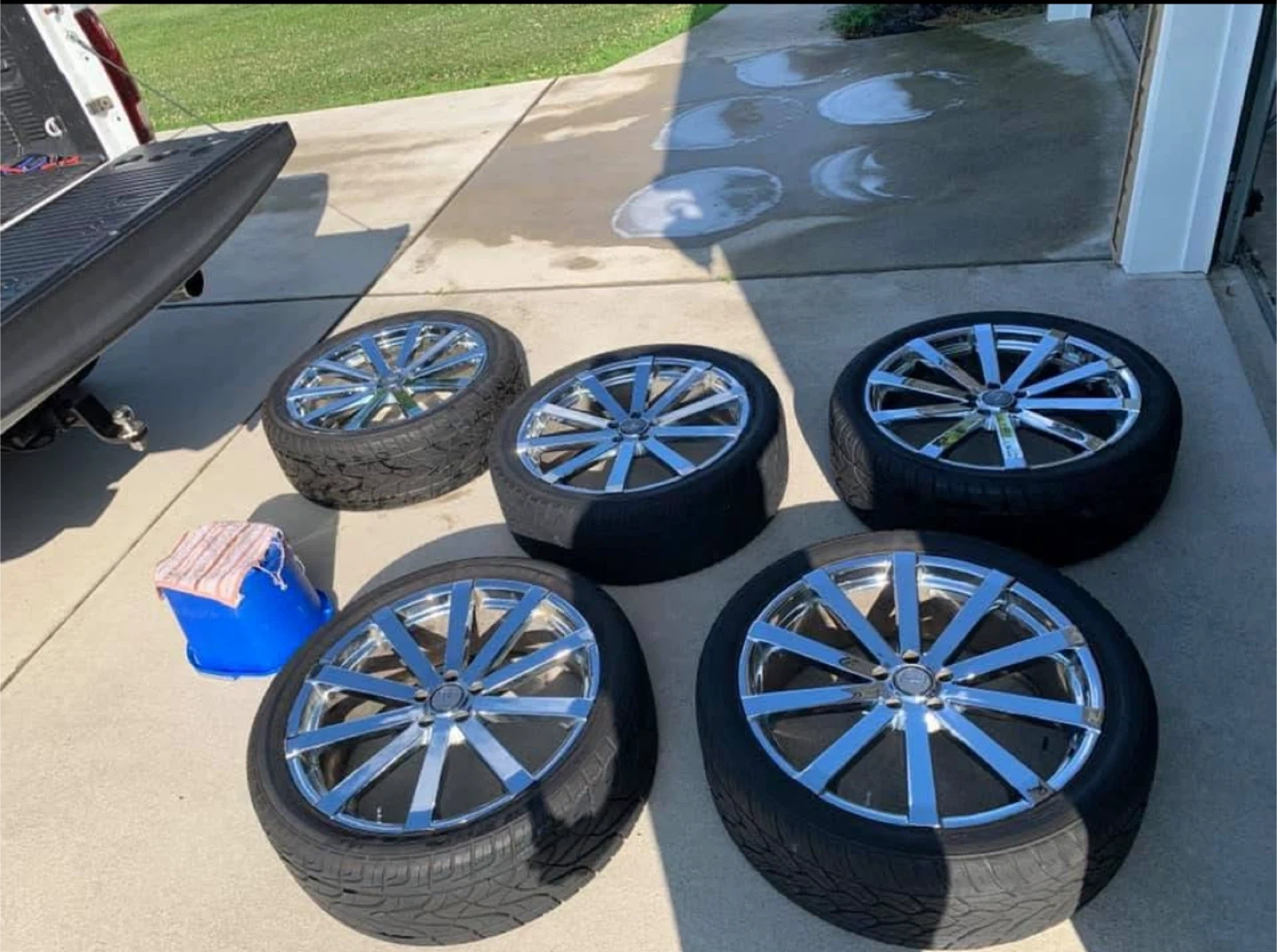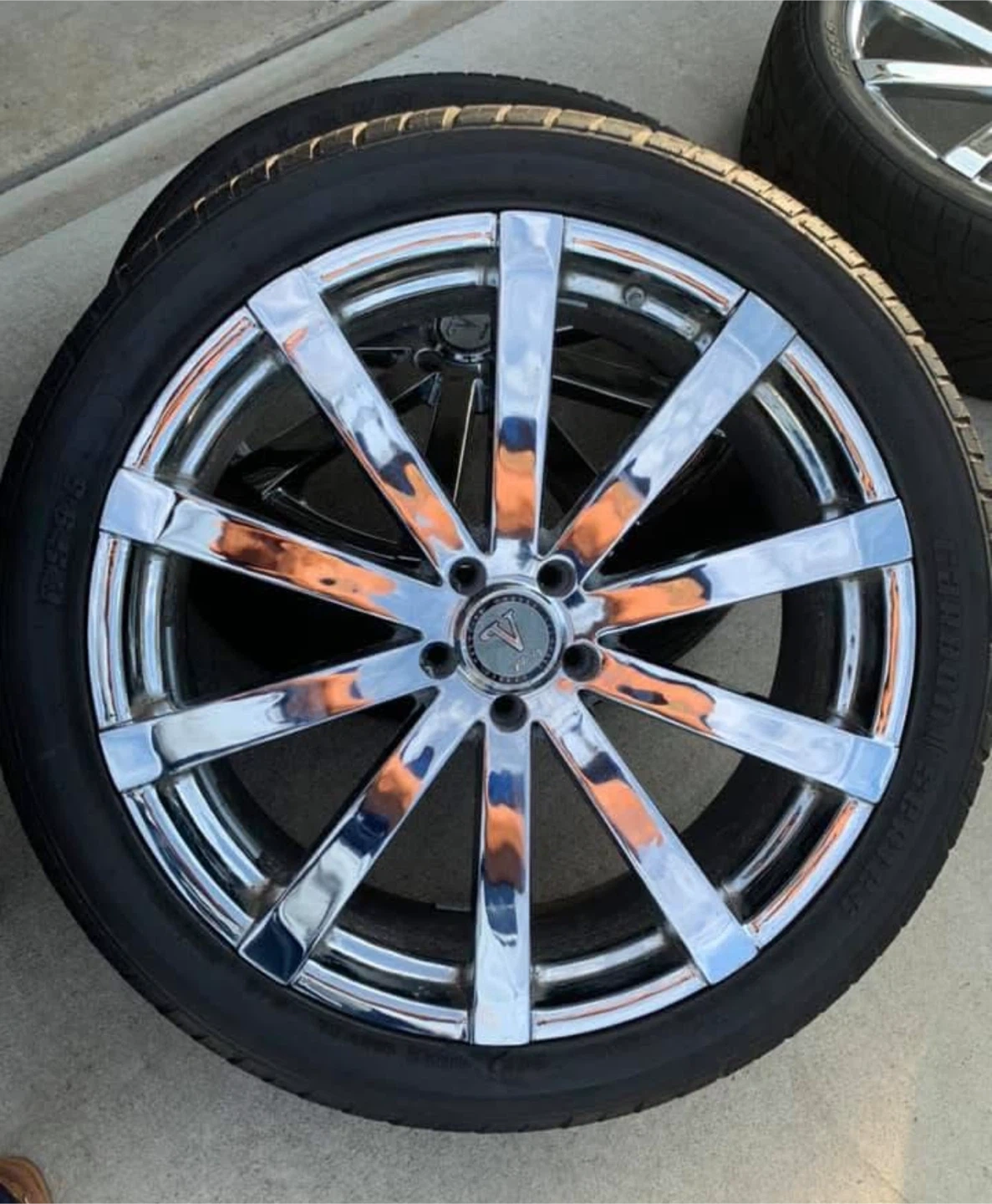 Set of four Velocity Wheels with chrome finish. These stylish rims will upgrade your vehicle's look. Center caps display the Velocity Wheels logo. Spare included, so total 5 rims and tires. Will fit a Acura MDX.