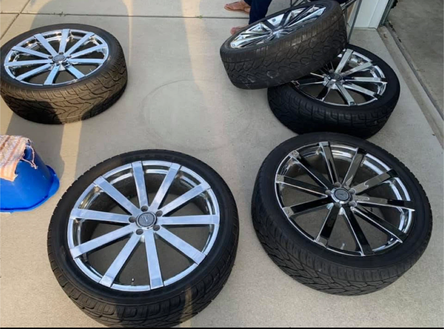 Set of four Velocity Wheels with chrome finish. These stylish rims will upgrade your vehicle's look. Center caps display the Velocity Wheels logo. Spare included, so total 5 rims and tires. Will fit a Acura MDX.
