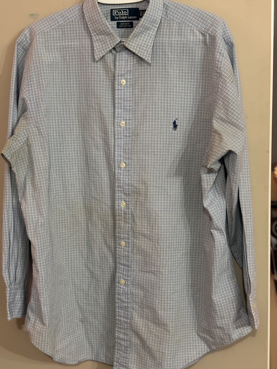 Selling a Polo by Ralph Lauren button-down shirt. It features a light blue and white checkered pattern and the classic Polo logo. Great for a casual or semi-formal look!